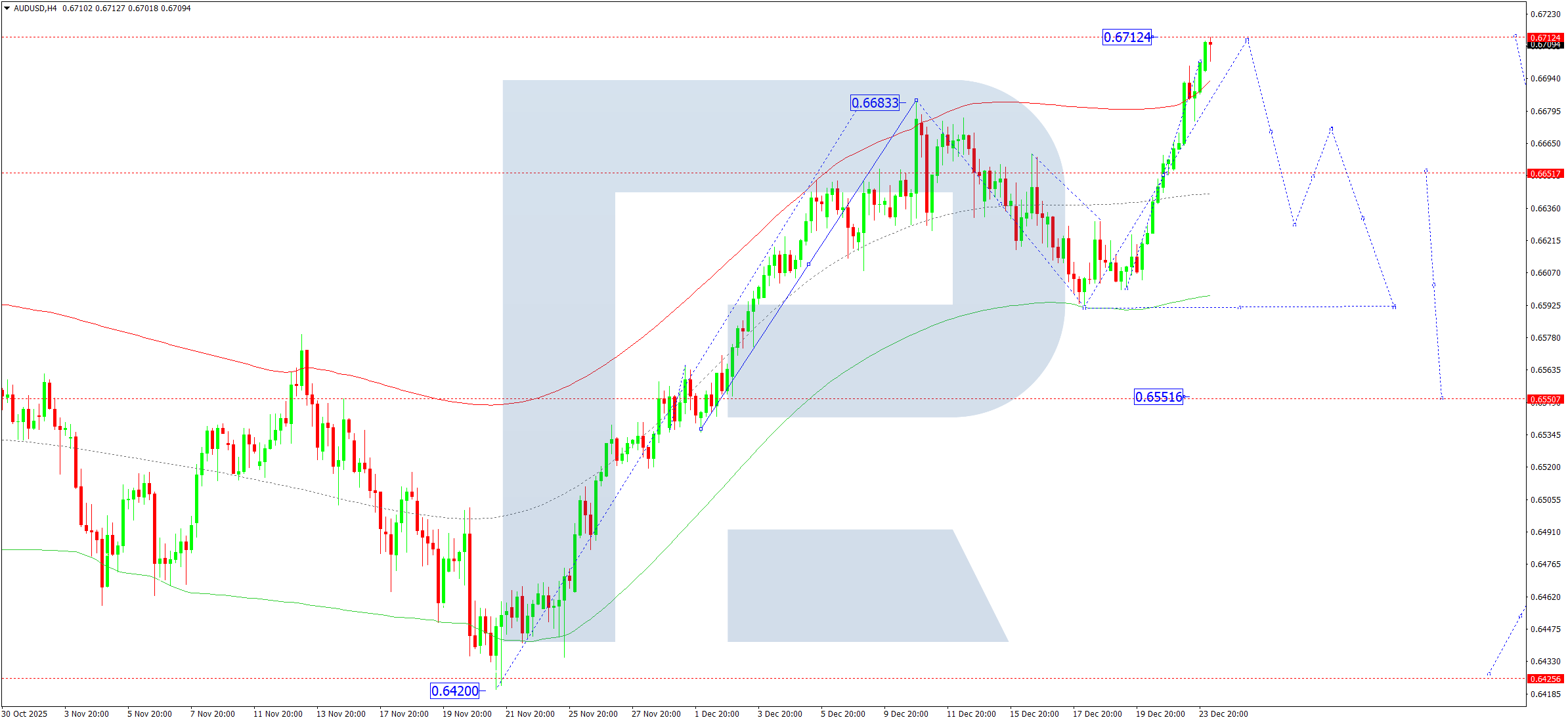 บนกราฟ H4 ของ AUDUSD ตลาดยังคงพัฒนาช่วงการแกว่งตัวแบบสะสมกำลังบริเวณระดับ 0.6655 วันนี้ 24 ธันวาคม 2025 ช่วงดังกล่าวได้ขยายตัวขึ้นไปถึงระดับ 0.6712 เราคาดว่าจะเกิดการปรับตัวลงสู่ระดับ 0.6655 หากระดับนี้ถูกทะลุลง จะเปิดโอกาสให้แนวโน้มเคลื่อนไหวต่อเนื่องไปยังระดับ 0.6555