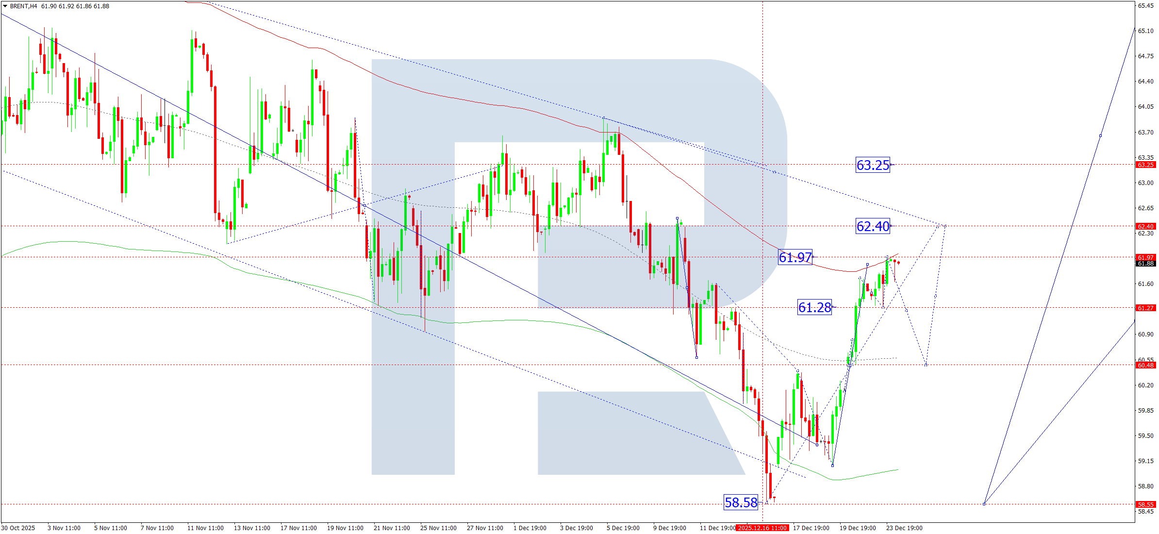 บนกราฟ H4 ของน้ำมันดิบ Brent ตลาดได้เสร็จสิ้นคลื่นขาขึ้นไปยังระดับ 61.97 ซึ่งเป็นเป้าหมายระยะสั้น วันนี้ 24 ธันวาคม 2025 เราคาดว่าจะเกิดการปรับตัวลงสู่ระดับ 60.50 หลังจากนั้น เราจะพิจารณาความเป็นไปได้ของการเริ่มต้นคลื่นขาขึ้นรอบใหม่ไปยังระดับ 62.46 ซึ่งเป็นเป้าหมายแรก หลังจากแตะระดับนี้แล้ว มีความเป็นไปได้ของการเคลื่อนไหวปรับฐานลงสู่ระดับ 60.50 ก่อนที่จะตามด้วยการปรับตัวขึ้นไปยังระดับ 63.50 ซึ่งเป็นเป้าหมายที่สอง