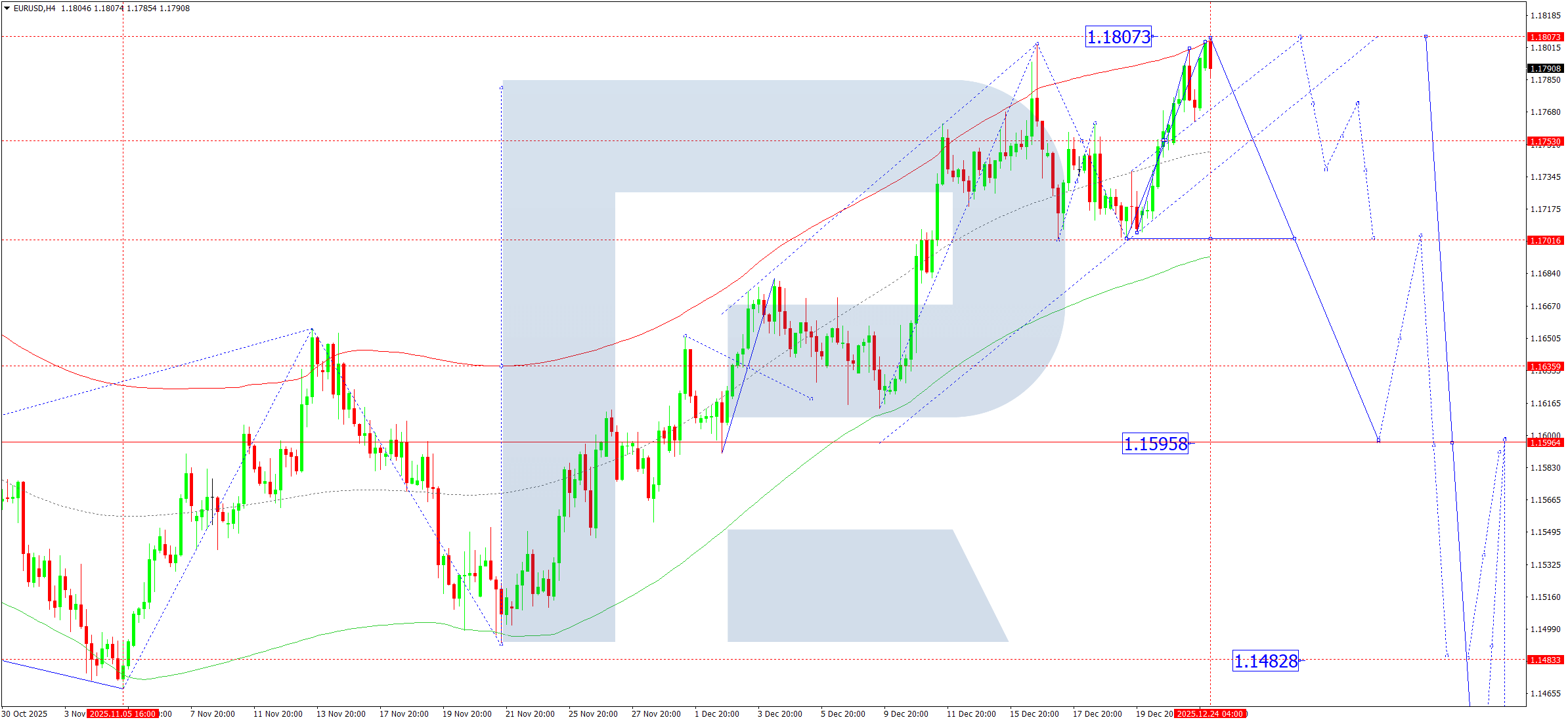 บนกราฟ H4 ของ EURUSD ตลาดยังคงพัฒนาช่วงการแกว่งตัวแบบสะสมกำลังบริเวณระดับ 1.1753 วันนี้ 24 ธันวาคม 2025 ช่วงดังกล่าวได้ขยายตัวขึ้นไปถึงระดับ 1.1807 ขั้นถัดไป เราจะพิจารณาความเป็นไปได้ของการปรับตัวลงสู่ขอบล่างของช่วงนี้ที่ระดับ 1.1700 หากราคาปรับตัวหลุดลง จะเปิดโอกาสให้คลื่นเคลื่อนไหวต่อเนื่องไปยังระดับ 1.1620 ในกรณีที่เกิดการทะลุขึ้นด้านบน มีความเป็นไปได้ของการปรับตัวขึ้นอีกระลอกไปยังระดับ 1.1810