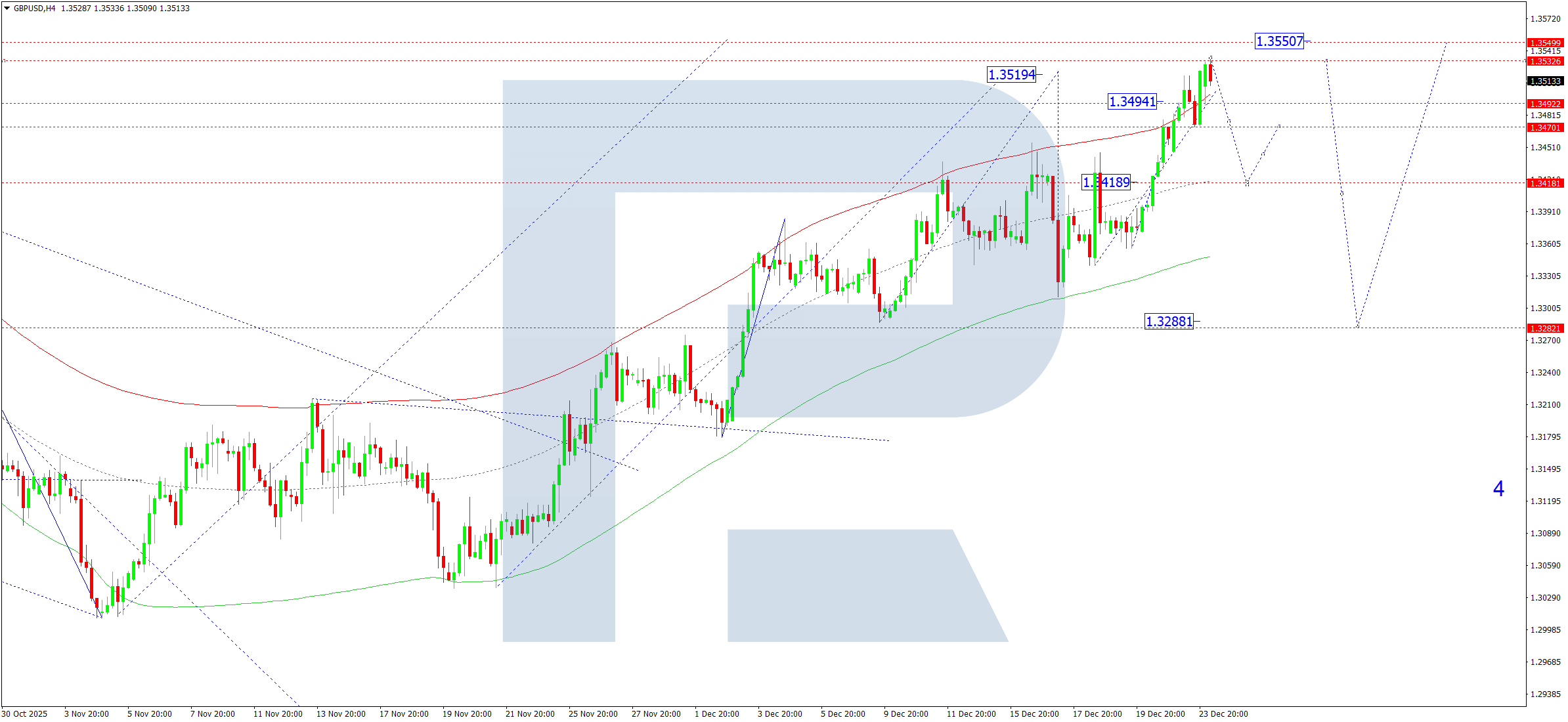 บนกราฟ H4 ของ GBPUSD ตลาดกำลังก่อตัวช่วงการแกว่งตัวแบบสะสมกำลังบริเวณระดับ 1.3420 วันนี้ 24 ธันวาคม 2025 เราคาดว่าช่วงดังกล่าวจะขยายตัวขึ้นไปยังระดับ 1.3538 หลังจากนั้น คาดว่าจะเกิดการปรับตัวลงสู่ระดับ 1.3482 หากระดับนี้ถูกทะลุลง จะเปิดโอกาสให้แนวโน้มเคลื่อนไหวต่อเนื่องไปยังระดับ 1.3288