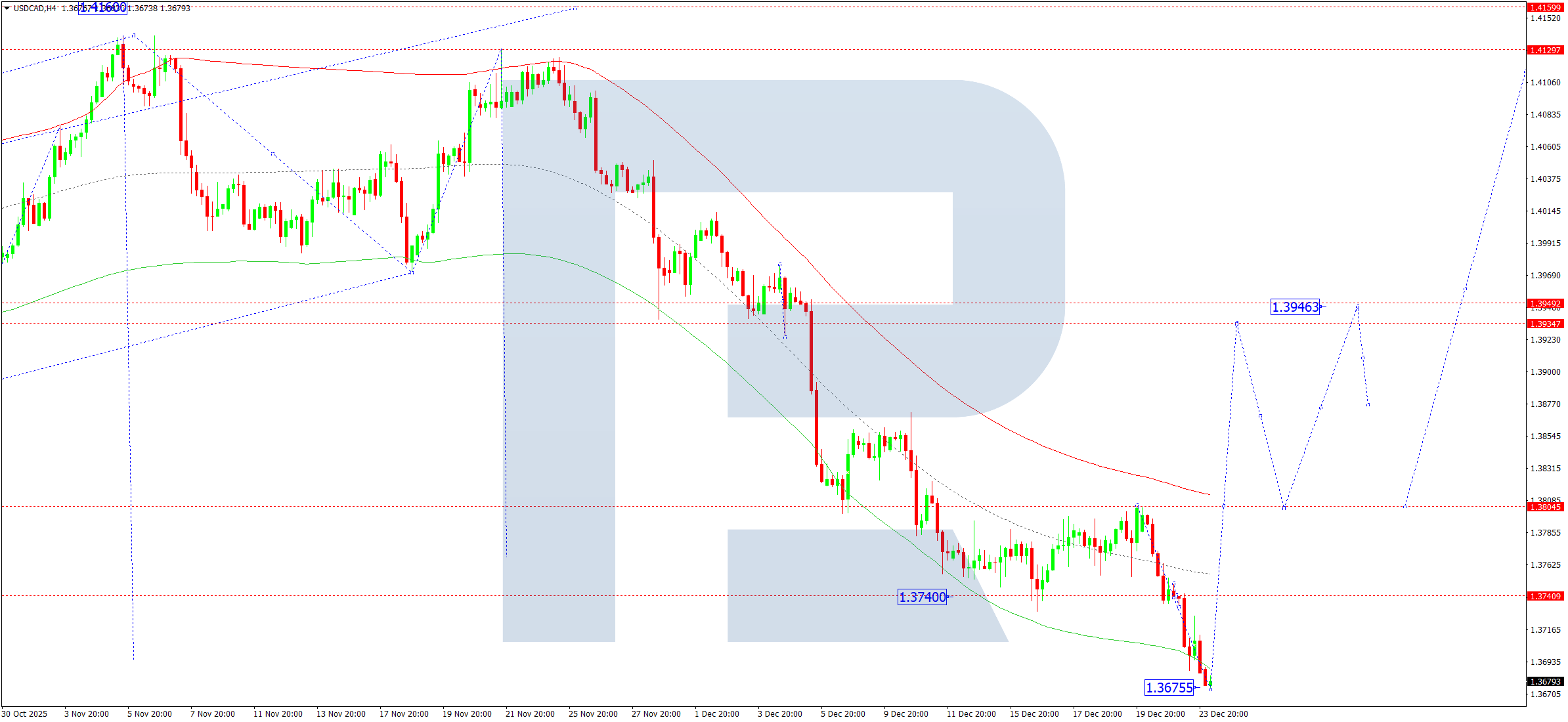 บนกราฟ H4 ของ USDCAD ตลาดยังคงก่อตัวช่วงการแกว่งตัวแบบสะสมกำลังบริเวณระดับ 1.3740 วันนี้ 24 ธันวาคม 2025 เราคาดว่าช่วงดังกล่าวจะขยายตัวลงไปยังระดับ 1.3675 หลังจากนั้น เราจะพิจารณาความเป็นไปได้ของการเริ่มต้นคลื่นขาขึ้นรอบใหม่ไปยังระดับ 1.3740 หากระดับนี้ถูกทะลุขึ้น จะพิจารณาความเป็นไปได้ของการเคลื่อนไหวต่อเนื่องไปยังระดับ 1.3940