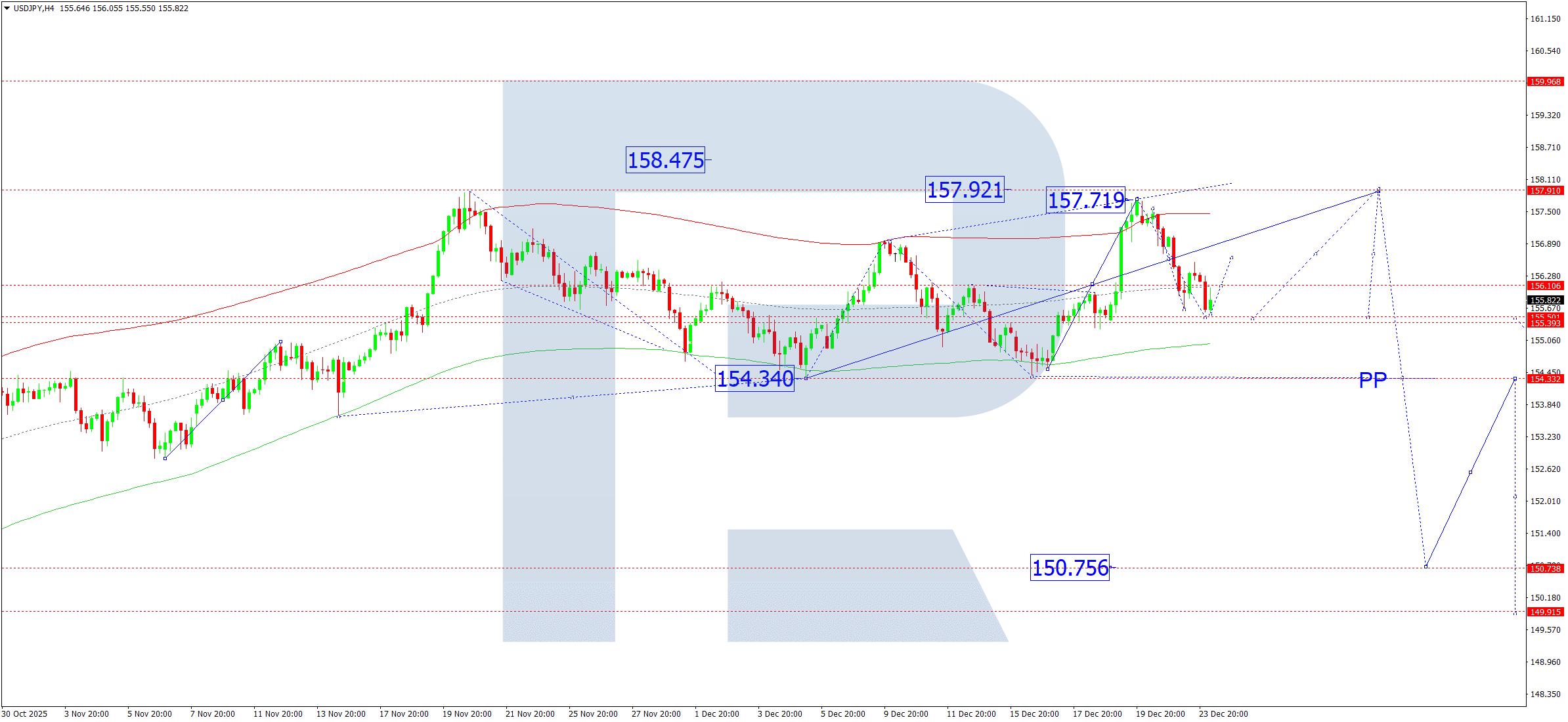 บนกราฟ H4 ของ USDJPY ตลาดยังคงพัฒนาการปรับฐานลงสู่ระดับ 155.50 วันนี้ 24 ธันวาคม 2025 เราจะพิจารณาความเป็นไปได้ที่การปรับฐานนี้จะสิ้นสุดลง และการเริ่มต้นของคลื่นขาขึ้นไปยังระดับ 157.92 หลังจากนั้น คาดว่าจะเกิดการปรับตัวลงสู่ระดับ 154.34