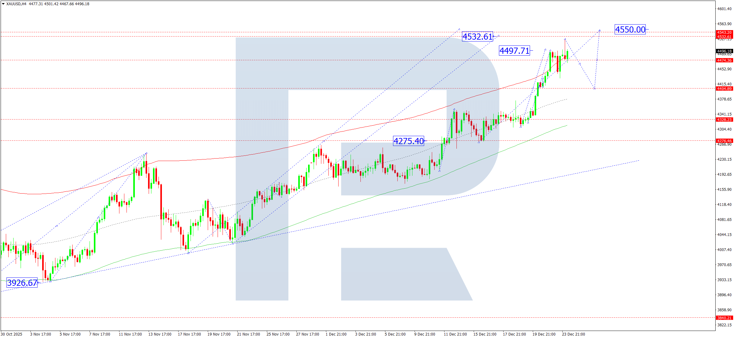 บนกราฟ H4 ของ XAUUSD ตลาดได้เสร็จสิ้นคลื่นขาขึ้นไปยังระดับ 4,525 วันนี้ 24 ธันวาคม 2025 มีความเป็นไปได้ของการเคลื่อนไหวปรับฐานลงสู่ระดับ 4,400 หลังจากนั้น เราจะพิจารณาความเป็นไปได้ของการปรับตัวขึ้นไปยังระดับ 4,532 พร้อมแนวโน้มที่อาจเคลื่อนไหวต่อเนื่องไปยังระดับ 4,550