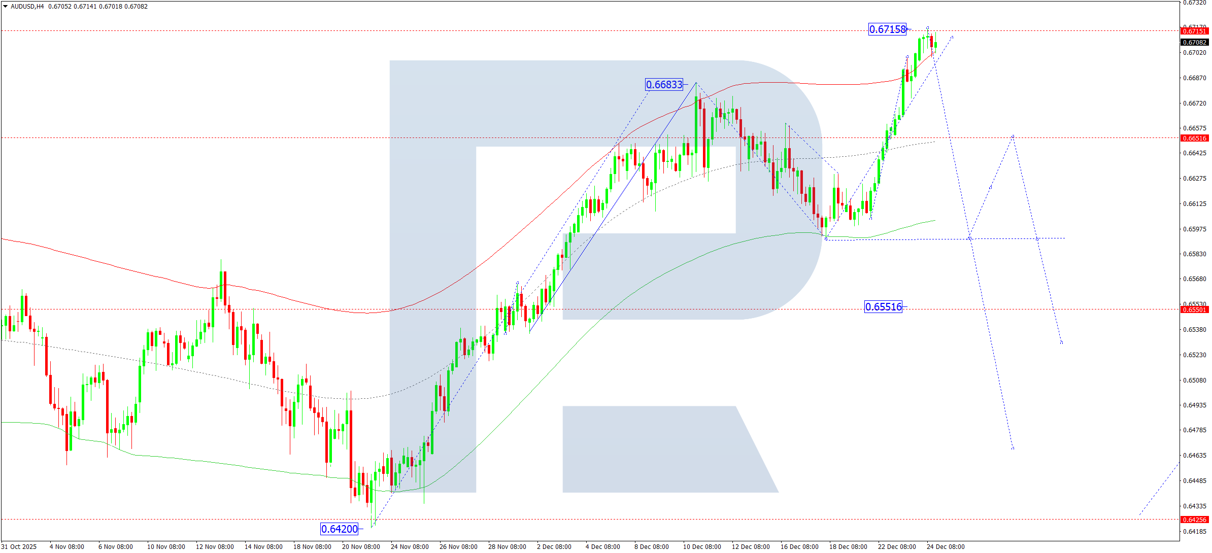 บนกราฟ H4 ของ AUDUSD ตลาดยังคงพัฒนาช่วงการแกว่งตัวแบบสะสมกำลังบริเวณระดับ 0.6655 วันนี้ 26 ธันวาคม 2025 ช่วงดังกล่าวได้ขยายตัวขึ้นไปถึงระดับ 0.6716 ขั้นถัดไป เราคาดว่าจะเกิดการปรับตัวลงสู่ระดับ 0.6655 หากระดับนี้ถูกทะลุลง จะเปิดโอกาสให้แนวโน้มเคลื่อนไหวต่อเนื่องไปยังระดับ 0.6555