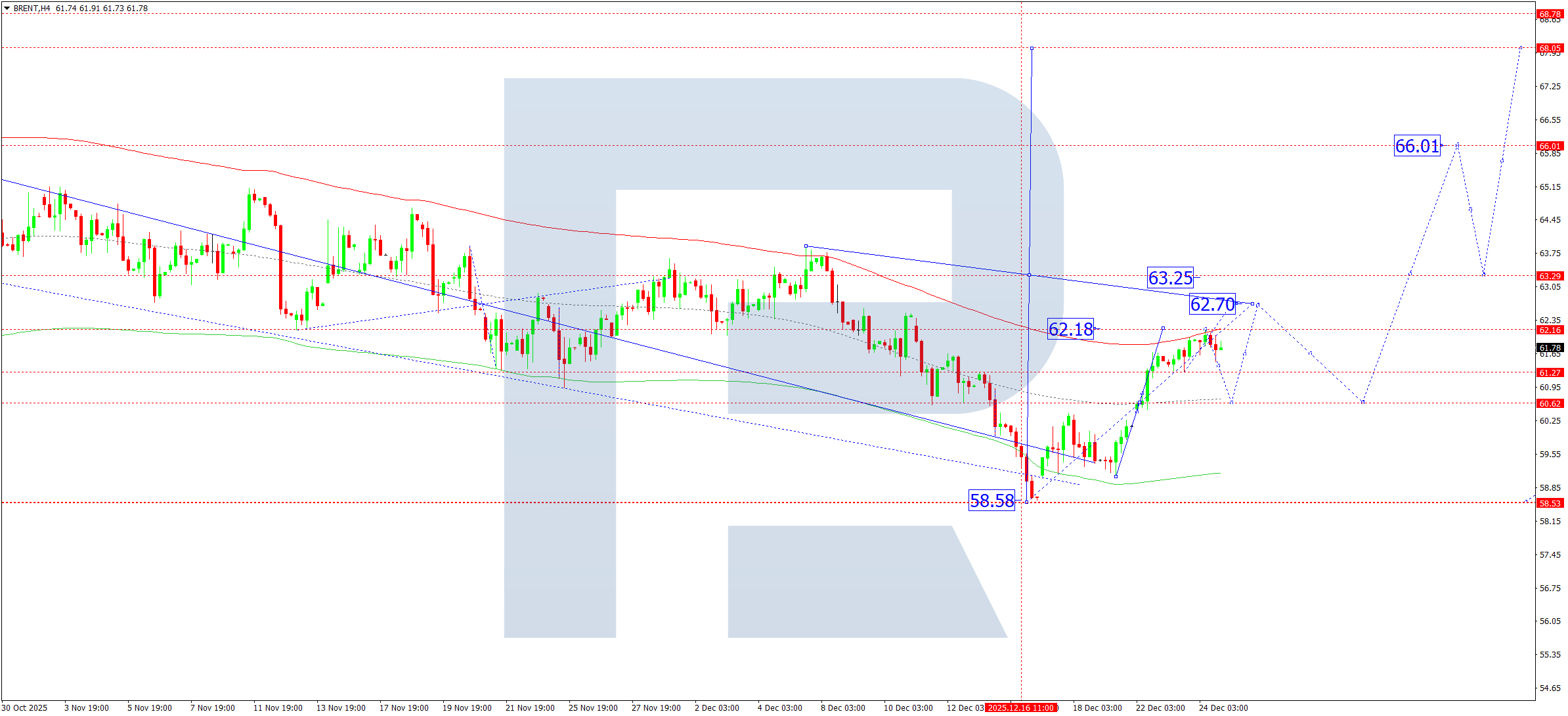 บนกราฟ H4 ของน้ำมันดิบ Brent ตลาดได้เสร็จสิ้นคลื่นขาขึ้นไปยังระดับ 62.18 ซึ่งเป็นเป้าหมายระยะสั้น วันนี้ 26 ธันวาคม 2025 เราคาดว่าจะเกิดการปรับตัวลงสู่ระดับ 60.62 หลังจากนั้น เราจะพิจารณาความเป็นไปได้ของการเริ่มต้นคลื่นขาขึ้นรอบใหม่ไปยังระดับ 62.70 ซึ่งเป็นเป้าหมายแรก ต่อมา มีความเป็นไปได้ของการเคลื่อนไหวปรับฐานลงสู่ระดับ 60.62 อีกระลอก ก่อนที่จะตามด้วยการปรับตัวขึ้นไปยังระดับ 63.50 ซึ่งเป็นเป้าหมายที่สอง