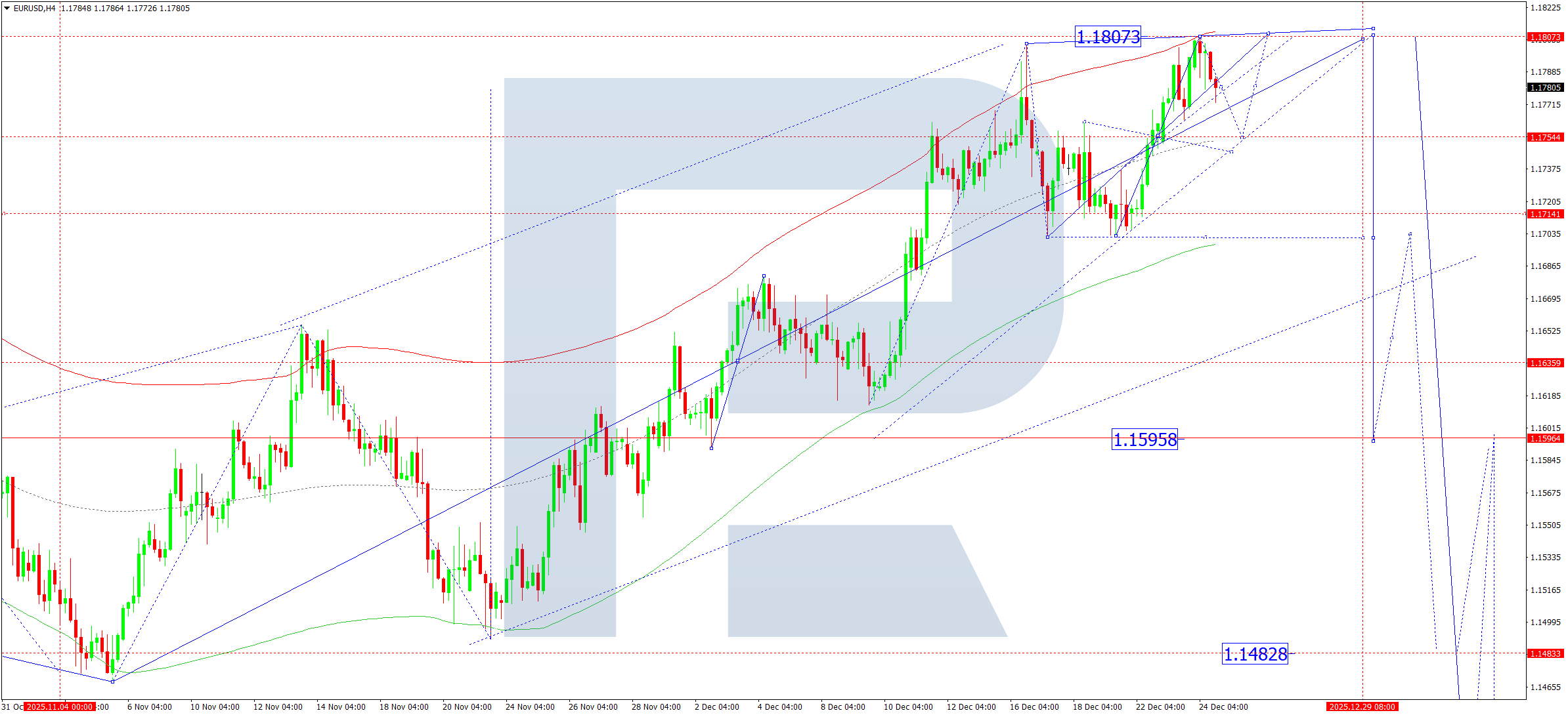บนกราฟ H4 ของ EURUSD ตลาดยังคงพัฒนาช่วงการแกว่งตัวแบบสะสมกำลังบริเวณระดับ 1.1755 วันนี้ 26 ธันวาคม 2025 ช่วงดังกล่าวได้ขยายตัวขึ้นไปถึงระดับ 1.1807 ขั้นถัดไป เราจะพิจารณาความเป็นไปได้ของการปรับตัวลงสู่ขอบล่างของช่วงนี้ที่ระดับ 1.1700 หากราคาปรับตัวหลุดลง จะเปิดโอกาสให้คลื่นเคลื่อนไหวต่อเนื่องไปยังระดับ 1.1620 ในกรณีที่เกิดการทะลุขึ้นด้านบน มีความเป็นไปได้ของการปรับตัวขึ้นอีกระลอกไปยังระดับ 1.1810