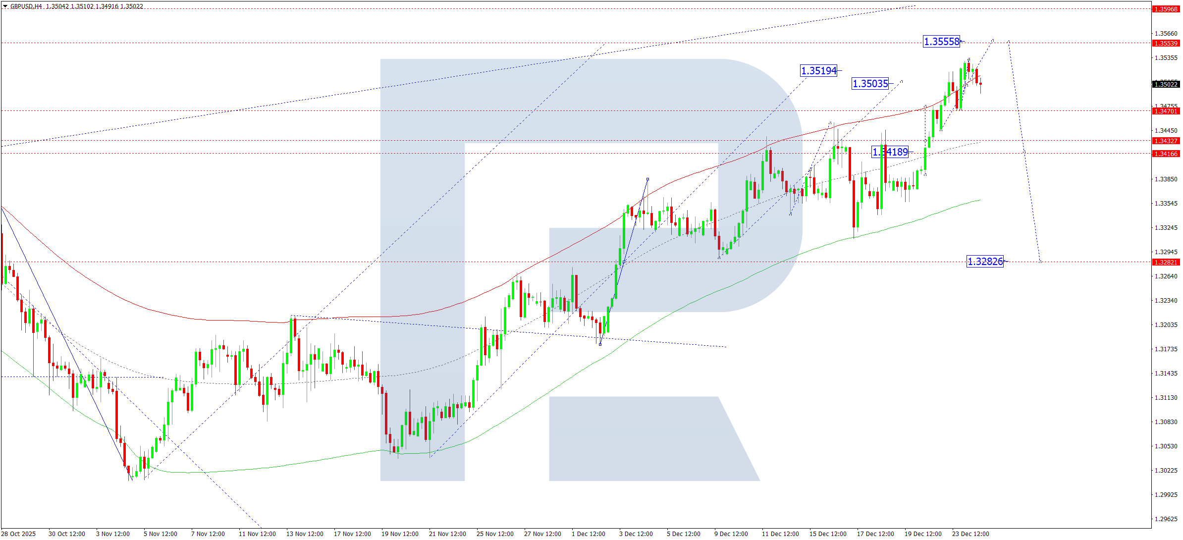 บนกราฟ H4 ของ GBPUSD ตลาดกำลังก่อตัวช่วงการแกว่งตัวแบบสะสมกำลังบริเวณระดับ 1.3505 วันนี้ 26 ธันวาคม 2025 เราคาดว่าช่วงดังกล่าวจะขยายตัวขึ้นไปยังระดับ 1.3555 หลังจากนั้น เราคาดว่าจะเกิดการปรับตัวลงสู่ระดับ 1.3434 หากระดับนี้ถูกทะลุลง จะเปิดโอกาสให้แนวโน้มเคลื่อนไหวต่อเนื่องไปยังระดับ 1.3282
