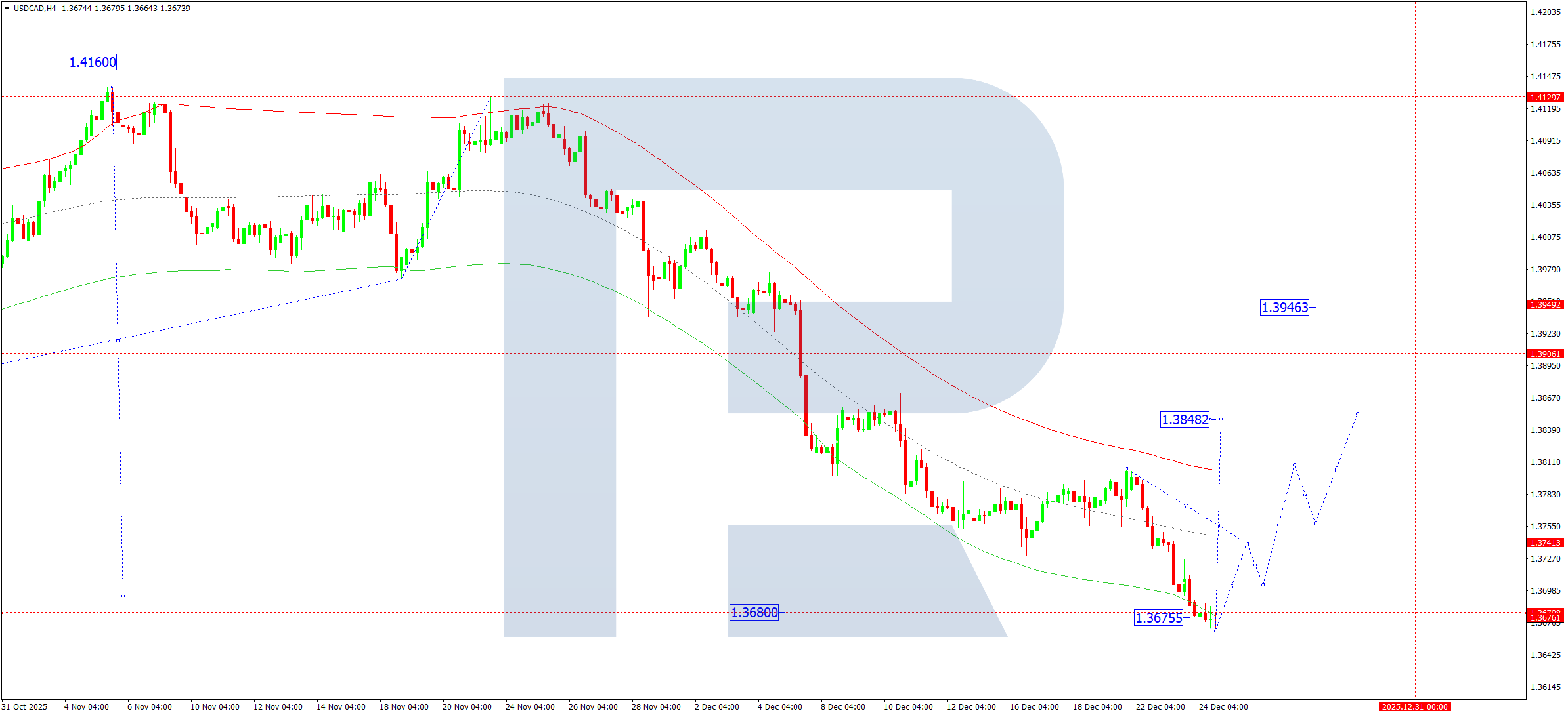 บนกราฟ H4 ของ USDCAD ตลาดยังคงก่อตัวช่วงการแกว่งตัวแบบสะสมกำลังบริเวณระดับ 1.3740 วันนี้ 26 ธันวาคม 2025 เราคาดว่าช่วงดังกล่าวจะขยายตัวลงไปยังระดับ 1.3666 หลังจากนั้น เราจะพิจารณาความเป็นไปได้ของการเริ่มต้นคลื่นขาขึ้นรอบใหม่ไปยังระดับ 1.3740 หากระดับนี้ถูกทะลุขึ้น เราจะพิจารณาความเป็นไปได้ของคลื่นที่เคลื่อนไหวต่อเนื่องไปยังระดับ 1.3848