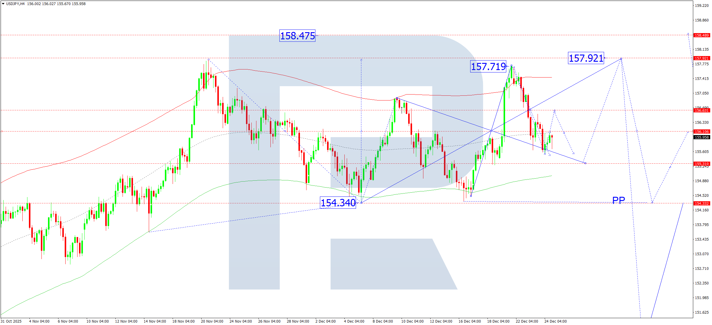 บนกราฟ H4 ของ USDJPY ตลาดยังคงพัฒนาช่วงการแกว่งตัวแบบสะสมกำลังบริเวณระดับ 156.10 วันนี้ 26 ธันวาคม 2025 เราจะพิจารณาความเป็นไปได้ที่ช่วงดังกล่าวจะขยายตัวลงไปยังระดับ 155.35 หลังจากนั้น เราคาดว่าจะเกิดการปรับตัวขึ้นไปยังระดับ 157.92