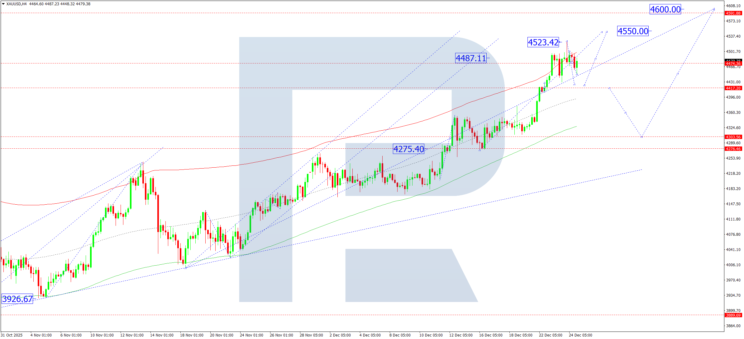 บนกราฟ H4 ของ XAUUSD ตลาดได้เสร็จสิ้นคลื่นขาขึ้นไปยังระดับ 4,525 วันนี้ 26 ธันวาคม 2025 มีความเป็นไปได้ของการเคลื่อนไหวปรับฐานลงสู่ระดับ 4,425 หลังจากนั้น เราจะพิจารณาความเป็นไปได้ของการปรับตัวขึ้นไปยังระดับ 4,555 พร้อมแนวโน้มที่อาจเคลื่อนไหวต่อเนื่องไปยังระดับ 4,600