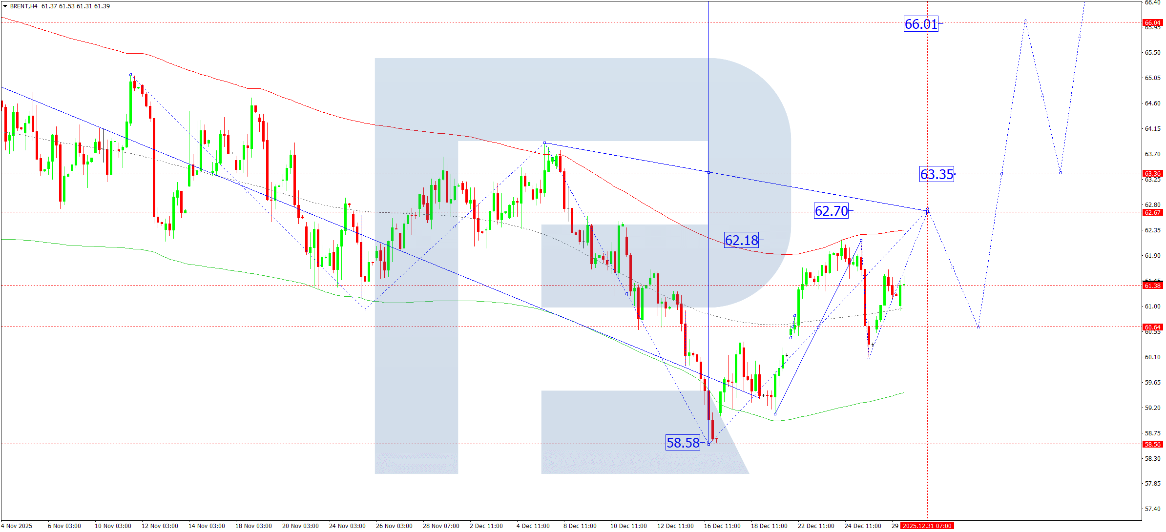ในเชิงเทคนิค สถานการณ์นี้ได้รับการยืนยันจากโครงสร้างคลื่น Elliott และ Matrix ของคลื่นขาขึ้นที่มีจุดศูนย์กลางการหมุนอยู่ที่ 60.60 สถานการณ์นี้ถือเป็นโครงสร้างหลักของคลื่น Brent ปัจจุบันตลาดได้เสร็จสิ้นคลื่นปรับฐานสู่เส้นกึ่งกลางของ Price Envelope ที่ระดับ 60.05 เราคาดว่าจะเห็นคลื่นขาขึ้นไปสู่ขอบบนของ Price Envelope ที่ระดับ 62.70