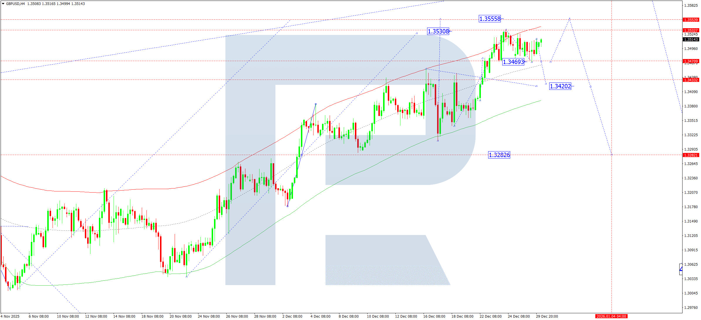 บนกราฟ H4 ของ GBPUSD ตลาดได้รับแรงหนุนที่ระดับ 1.3469 วันนี้ 30 ธันวาคม 2025 มีความเป็นไปได้ที่จะเกิดคลื่นขาขึ้นสู่ระดับ 1.3555 หลังจากแตะระดับนี้แล้ว เราคาดว่าจะเห็นการปรับตัวลงกลับมาที่ 1.3469 หากระดับนี้ถูกทะลุลง จะเปิดโอกาสให้แนวโน้มเคลื่อนไหวต่อไปสู่ระดับ 1.3282 ซึ่งเป็นเป้าหมายแรก