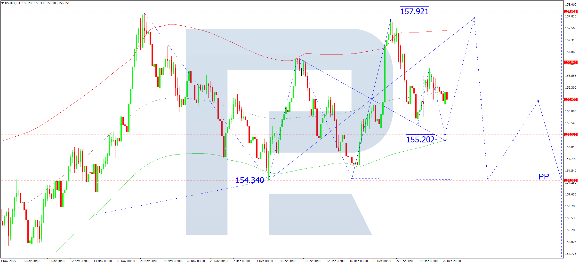 ตัวชี้วัดทางเทคนิคสำหรับการคาดการณ์ USDJPY วันนี้ แนะนำให้พิจารณาความเป็นไปได้ของการปรับตัวลงสู่ระดับ 155.20