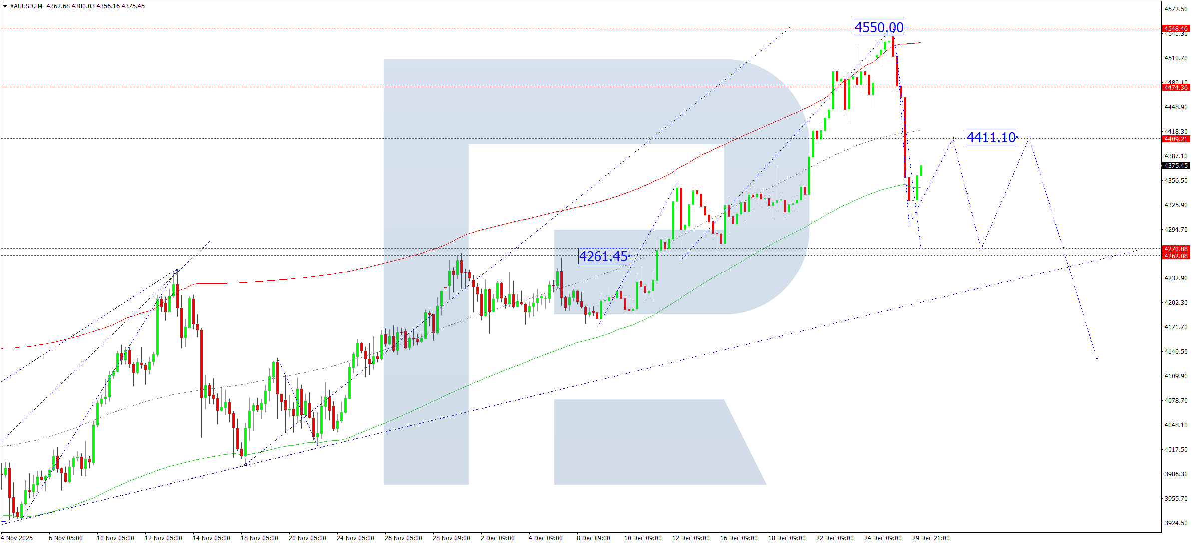 บนกราฟ H4 ของ XAUUSD ตลาดได้เสร็จสิ้นคลื่นขาลงสู่ระดับ 4,300 ซึ่งเป็นเป้าหมายในระยะสั้น วันนี้ 30 ธันวาคม 2025 มีความเป็นไปได้ที่จะเกิดคลื่นปรับฐานขึ้นไปสู่ระดับ 4,411 หลังจากนั้นเราจะพิจารณาความเป็นไปได้ของการพัฒนาคลื่นขาลงสู่ระดับ 4,270 ซึ่งเป็นเป้าหมายแรก
