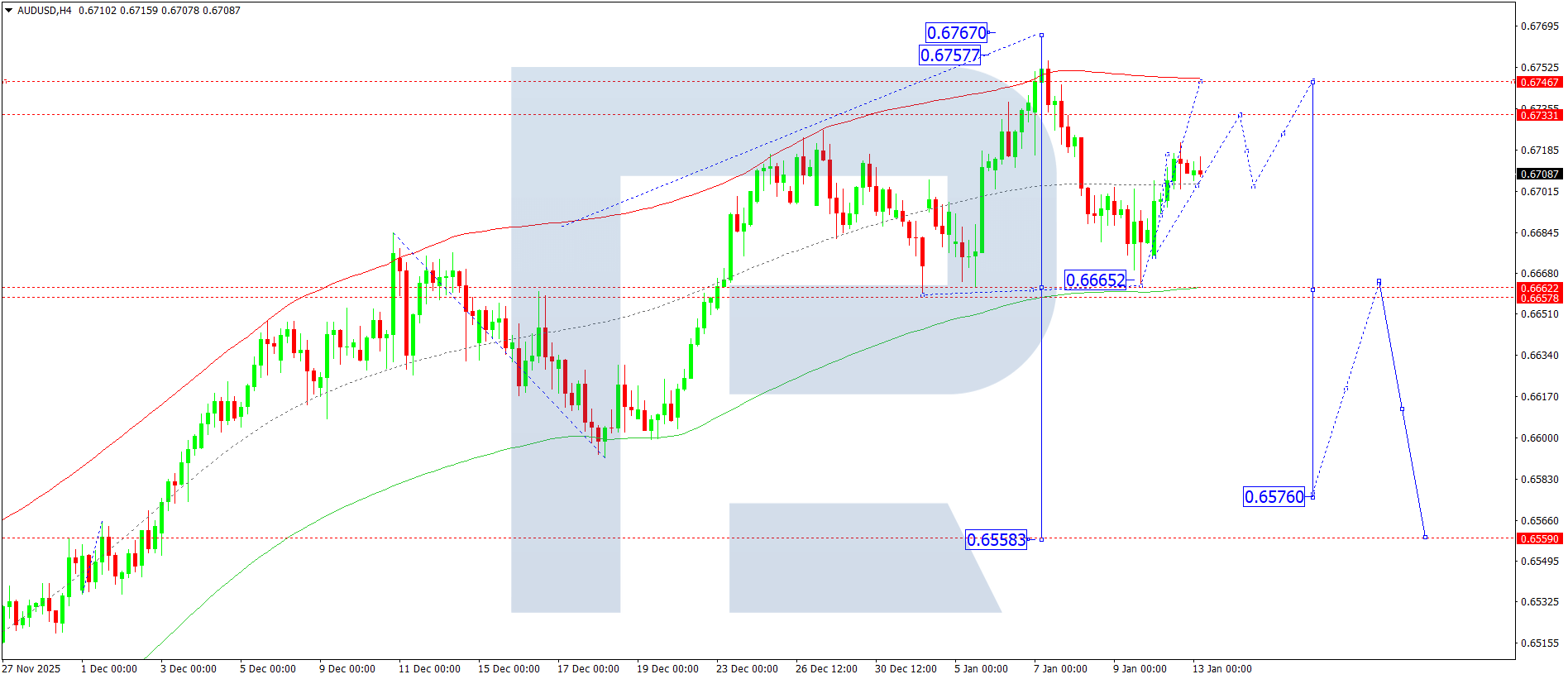 บนกราฟ H4 ของ AUDUSD ตลาดกำลังก่อตัวช่วงการแกว่งตัวแบบสะสมกำลังบริเวณระดับ 0.6700 วันนี้ 13 มกราคม 2026 คาดว่าจะมีการปรับตัวขึ้นไปยัง 0.6733 จากนั้นคาดว่าจะเกิดการปรับตัวลงสู่ระดับ 0.6600 พร้อมแนวโน้มที่อาจต่อเนื่องไปยัง 0.6577
