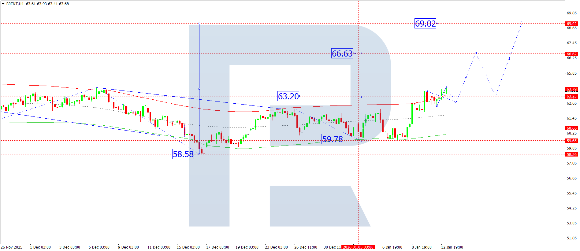 บนกราฟ H4 ของ Brent ตลาดได้เสร็จสิ้นคลื่นขาขึ้นไปยังระดับ 63.80 วันนี้ 13 มกราคม 2026 คาดว่าจะเกิดขาปรับฐานลงสู่ 63.00 และการก่อตัวของช่วงการแกว่งตัวแบบสะสมกำลังบริเวณระดับดังกล่าว หากราคาทะลุลงต่ำกว่าช่วงนี้ อาจขยายการปรับฐานลงไปยังระดับ 61.70 ในทางกลับกัน หากทะลุขึ้น จะเปิดโอกาสให้เกิดคลื่นขาขึ้นไปยังระดับ 66.66