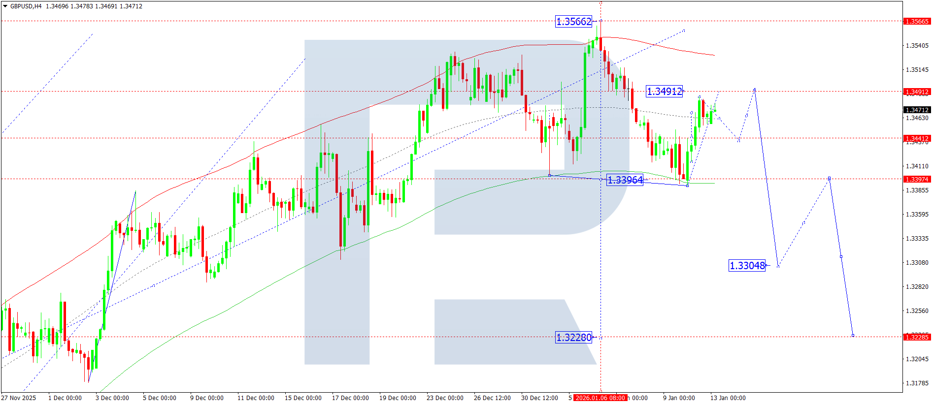 บนกราฟ H4 ของ EURUSD ตลาดยังคงพัฒนาการปรับฐานของแรงส่งขาลงลำดับที่สอง วันนี้ 13 มกราคม 2026 กำลังก่อตัวโครงสร้างขาลงไปยังระดับ 1.1636 ไม่สามารถตัดความเป็นไปได้ของการปรับตัวขึ้นต่อไปยัง 1.1704 ออกไปได้ ณ จุดนี้ ศักยภาพการปรับฐานจะถูกใช้จนหมด หลังจากการปรับฐานเสร็จสิ้น คาดว่าจะเริ่มต้นแรงส่งขาลงรอบใหม่ โดยมีเป้าหมายแรกที่ระดับ 1.1555