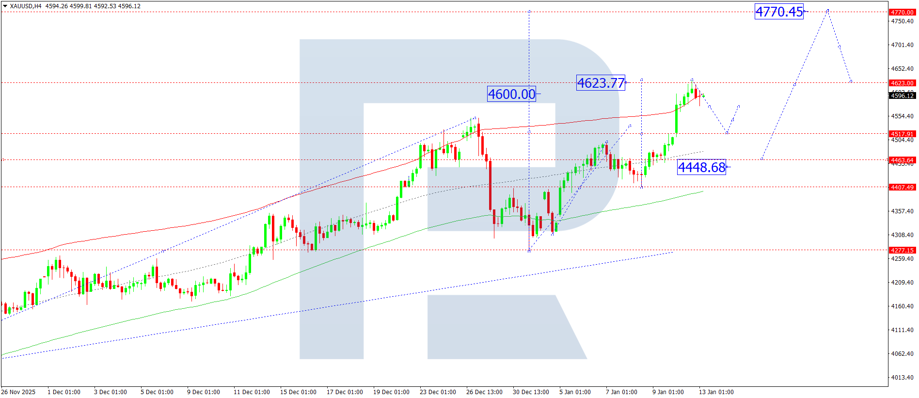บนกราฟ H4 ของ XAUUSD ตลาดได้ทะลุขึ้นเหนือระดับ 4,500 และเสร็จสิ้นคลื่นขาขึ้นไปยัง 4,624 คาดว่าราคาจะปรับฐานลงสู่ 4,520 (การทดสอบจากด้านบน) วันนี้ 13 มกราคม 2026 ก่อนจะปรับตัวขึ้นในภายหลังไปยัง 4,770 ซึ่งเป็นเป้าหมายระยะสั้น