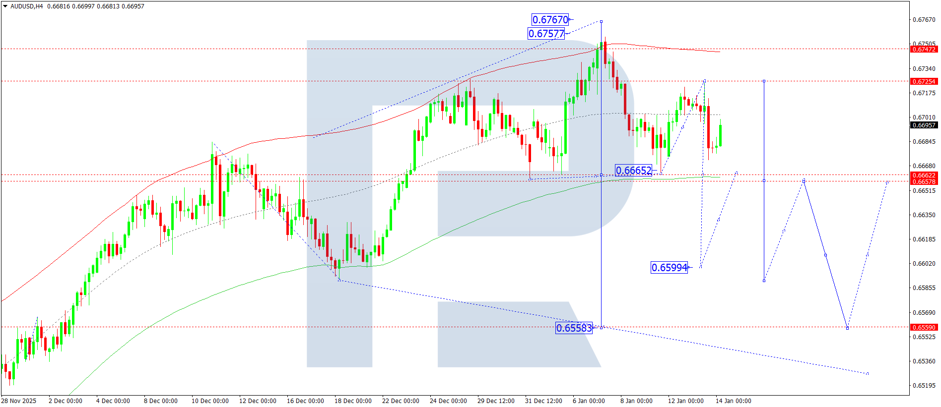 บนกราฟ H4 ของ AUDUSD ตลาดกำลังก่อตัวเป็นกรอบการแกว่งตัวสะสมบริเวณระดับ 0.6700 วันนี้ 14 มกราคม 2026 คาดว่าจะเกิดคลื่นขาขึ้นสู่ระดับ 0.6733 จากนั้นคาดว่าจะเกิดการปรับตัวลงสู่ระดับ 0.6600 พร้อมโอกาสที่แนวโน้มจะขยายต่อไปสู่ระดับ 0.6560