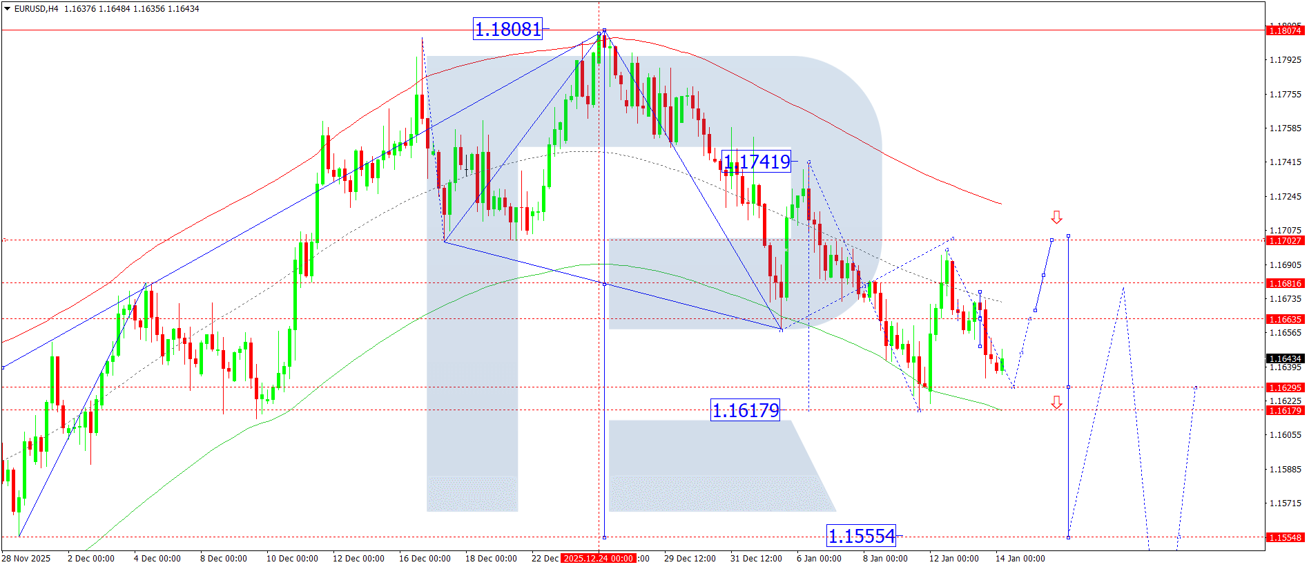 บนกราฟ H4 ของ EURUSD ตลาดได้ก่อตัวเป็นกรอบการแกว่งตัวสะสมบริเวณระดับ 1.1665 และหลังจากหลุดกรอบล่างแล้ว ยังคงพัฒนาคลื่นขาลงต่อไปสู่ระดับ 1.1629 วันนี้ 14 มกราคม 2026 คาดว่าคู่เงินจะไปถึงเป้าหมายนี้ จากนั้นมีความเป็นไปได้ที่จะเกิดคลื่นขาขึ้นอีกระลอกหนึ่งสู่ระดับ 1.1665 หากระดับนี้ถูกทะลุขึ้นไป การปรับตัวขึ้นอาจขยายต่อไปสู่ระดับ 1.1700 ณ จุดนี้ ศักยภาพของการปรับฐานจะถูกใช้ไปจนหมด หลังจากการปรับฐานครั้งนี้สิ้นสุดลง คาดว่าจะเริ่มคลื่นขาลงรอบใหม่สู่ระดับ 1.1555 ซึ่งเป็นเป้าหมายแรก