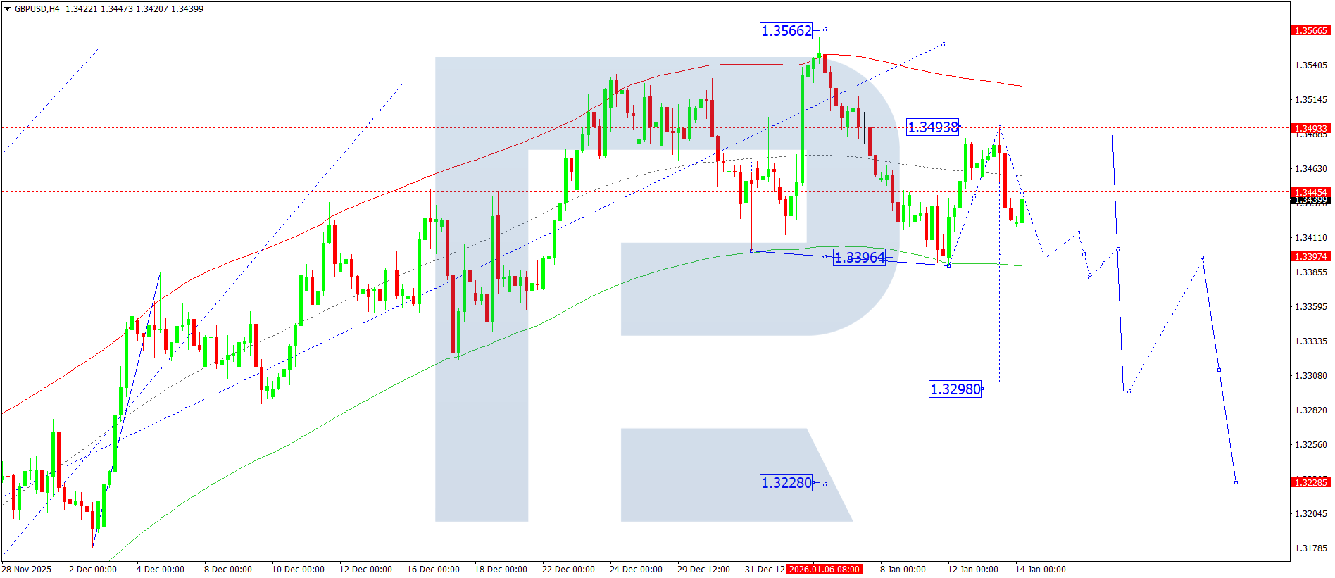 บนกราฟ H4 ของ GBPUSD ตลาดยังคงพัฒนาคลื่นขาลงต่อไปสู่ระดับ 1.3393 วันนี้ 14 มกราคม 2026 คาดว่าคู่เงินจะไปถึงเป้าหมายนี้ จากนั้นคาดว่าจะเกิดการปรับตัวขึ้นสู่ระดับ 1.3494 ณ จุดนี้ ศักยภาพของการปรับฐานจะถูกใช้ไปจนหมด หลังจากนั้นเหมาะสมที่จะพิจารณาการเริ่มต้นของคลื่นขาลงสู่ระดับ 1.3300 ซึ่งเป็นเป้าหมายในระยะใกล้