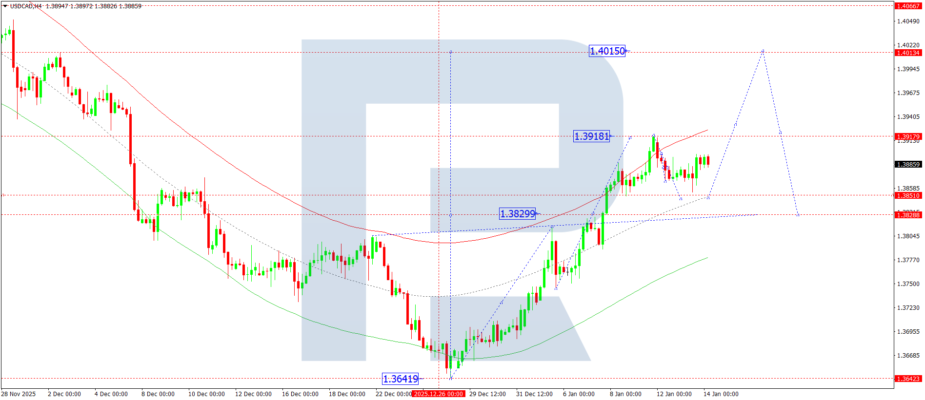 บนกราฟ H4 ของ USDCAD ตลาดกำลังก่อตัวเป็นกรอบการแกว่งตัวสะสมบริเวณระดับ 1.3883 วันนี้ 14 มกราคม 2026 คาดว่าจะเกิดการปรับตัวลงสู่ระดับ 1.3850 หลังจากการปรับฐานนี้เสร็จสิ้น อาจเริ่มคลื่นขาขึ้นรอบใหม่สู่ระดับ 1.4010 ซึ่งเป็นเป้าหมายแรก