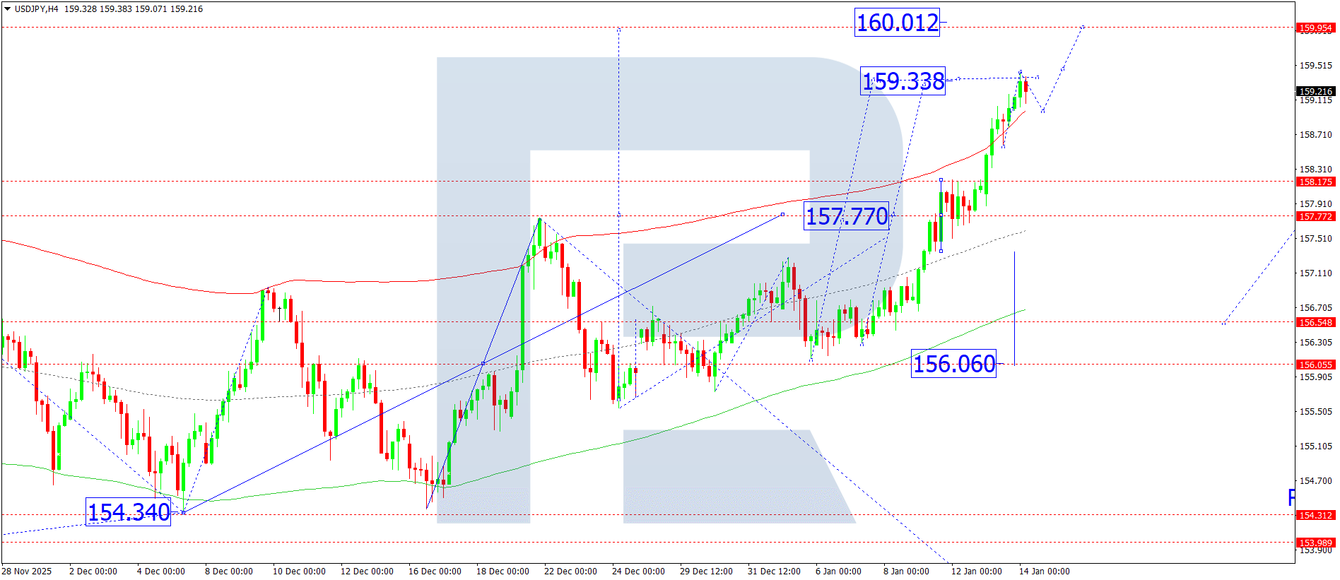 บนกราฟ H4 ของ USDJPY ตลาดได้ทะลุระดับ 158.18 ขึ้นมา และเสร็จสิ้นคลื่นขาขึ้นสู่ระดับ 159.33 วันนี้ 14 มกราคม 2026 มีความเป็นไปได้ที่จะเกิดการปรับฐานลงสู่ระดับ 159.00 (การทดสอบจากด้านบน) หลังจากนั้นอาจเกิดการปรับตัวขึ้นต่อไปสู่ระดับ 160.00