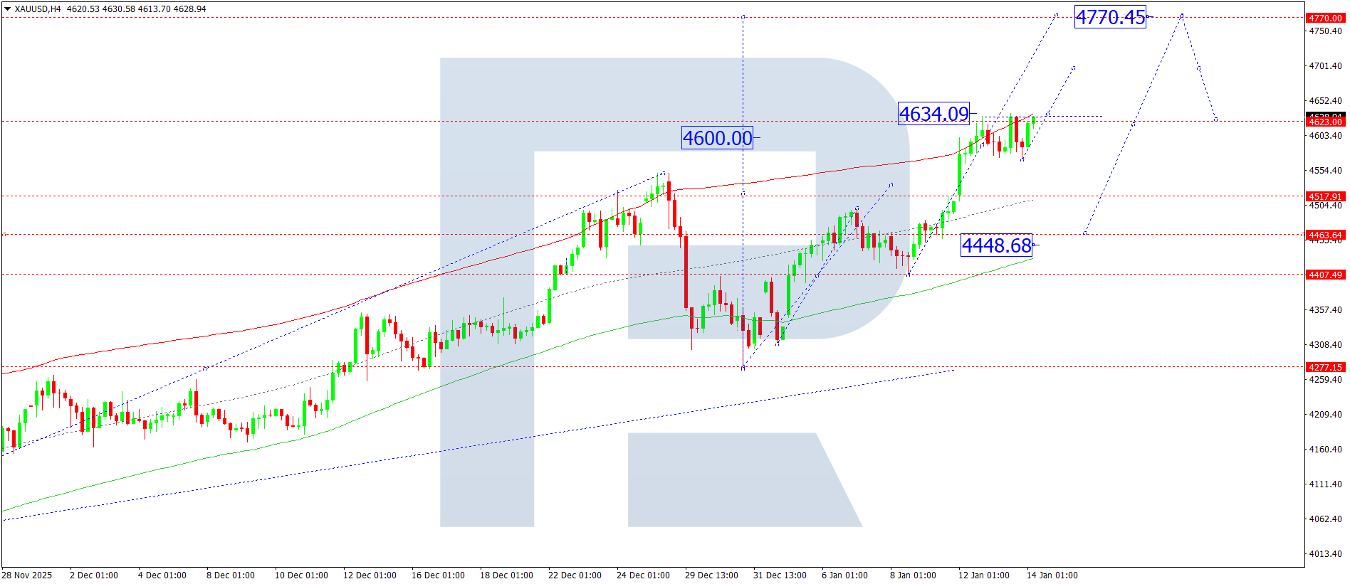 บนกราฟ H4 ของ XAUUSD ตลาดได้ทะลุระดับ 4,644 ขึ้นมา และยังคงพัฒนาคลื่นขาขึ้นต่อไปสู่ระดับ 4,770 วันนี้ 14 มกราคม 2026 คาดว่าจะไปถึงเป้าหมายนี้ ซึ่งเป็นเป้าหมายในระยะใกล้ จากนั้นอาจเริ่มเกิดการปรับฐานลงสู่ระดับ 4,633