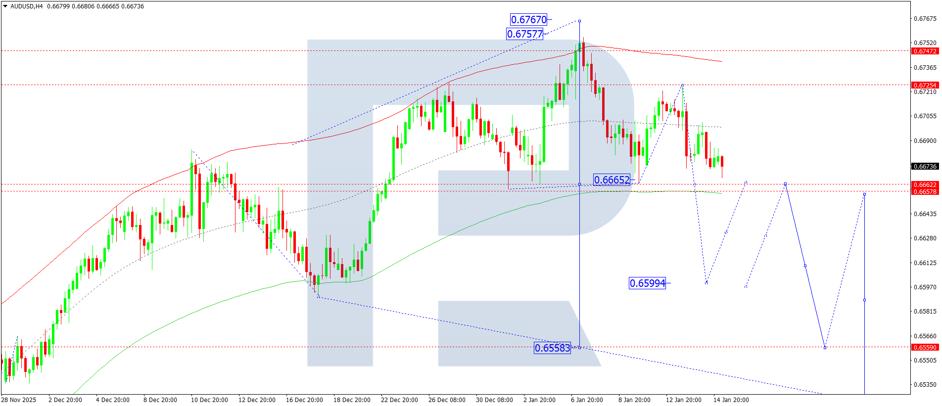 บนกราฟ H4 ของ AUDUSD ตลาดกำลังก่อตัวช่วงการแกว่งตัวแบบสะสมกำลังบริเวณระดับ 0.6700 วันนี้ 15 มกราคม 2026 ช่วงดังกล่าวได้ขยายตัวลงไปยังระดับ 0.6666 คาดว่าจะเกิดการปรับฐานขึ้นไปยังระดับ 0.6695 หลังจากนั้น อาจเริ่มต้นคลื่นขาลงไปยังระดับ 0.6655 การหลุดต่ำกว่าระดับนี้จะเปิดทางไปสู่ระดับ 0.6595