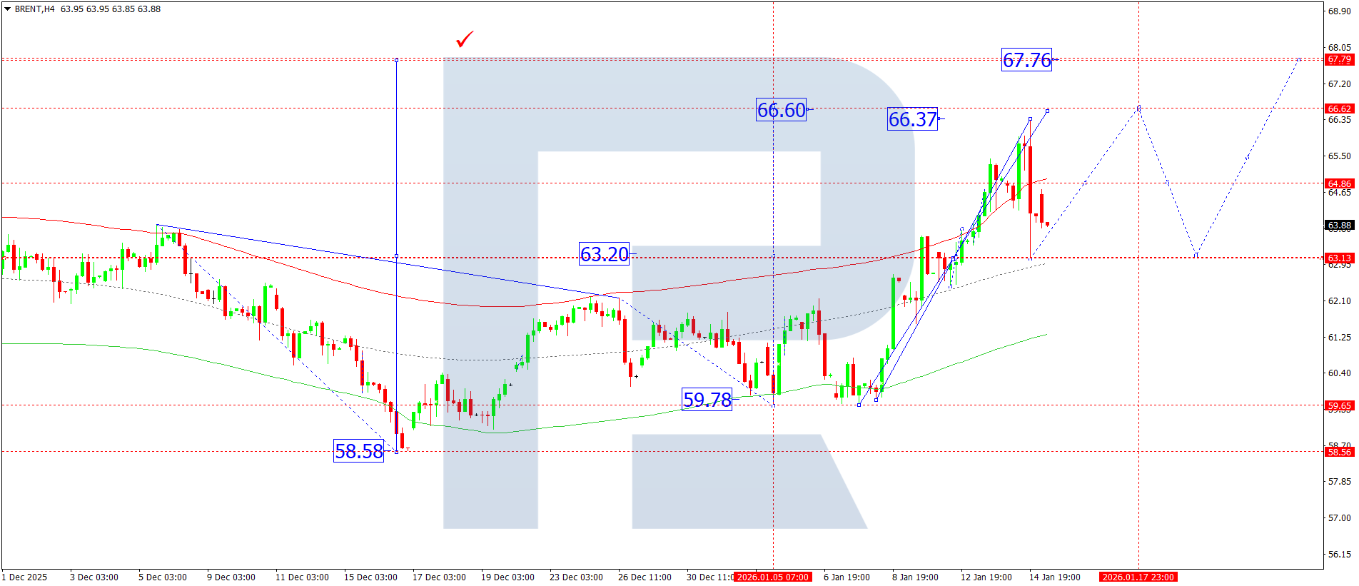 บนกราฟ H4 ของ Brent ตลาดได้เสร็จสิ้นคลื่นขาขึ้นไปยังระดับ 66.74 และปรับฐานลงสู่ระดับ 63.20 วันนี้ 15 มกราคม 2026 อาจเกิดคลื่นขาขึ้นไปยังระดับ 66.66 พร้อมแนวโน้มที่อาจขยายตัวต่อไปยังระดับ 67.76