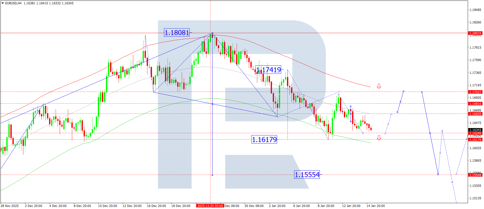 บนกราฟ H4 ของ EURUSD ตลาดยังคงพัฒนาคลื่นขาลงไปยังระดับ 1.1629 วันนี้ 15 มกราคม 2026 คาดว่าคู่เงินจะไปถึงเป้าหมายนี้ จากนั้นมีความเป็นไปได้ของการปรับตัวขึ้นไปยังระดับ 1.1665 หากระดับนี้ถูกทะลุขึ้น จะเปิดโอกาสให้ราคาปรับตัวขึ้นต่อไปยังระดับ 1.1700 ณ จุดนี้ ศักยภาพของการปรับฐานจะถูกใช้จนหมด หลังจากการปรับฐานเสร็จสิ้น คาดว่าจะเริ่มต้นแรงส่งขาลงรอบใหม่ โดยมีเป้าหมายแรกที่ระดับ 1.1555 การหลุดต่ำกว่าระดับ 1.1617 จะเปิดโอกาสให้โมเมนตัมขาลงดำเนินต่อไปโดยไม่ต้องมีการปรับฐานเพิ่มเติม