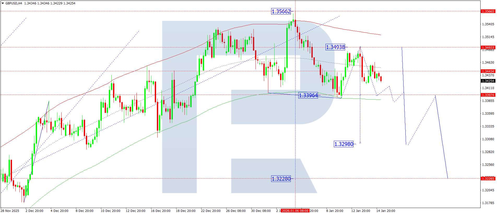 บนกราฟ H4 ของ GBPUSD ตลาดยังคงพัฒนาคลื่นขาลงไปยังระดับ 1.3393 คาดว่าคู่เงินจะไปถึงเป้าหมายนี้ในวันนี้ 15 มกราคม 2026 ก่อนจะปรับตัวขึ้นไปยังระดับ 1.3494 ณ จุดนี้ ศักยภาพของการปรับฐานจะถูกใช้จนหมด หลังจากนั้น มีความเหมาะสมที่จะพิจารณาการเริ่มต้นของคลื่นขาลงไปยังระดับ 1.3300 ซึ่งเป็นเป้าหมายระยะสั้น การหลุดต่ำกว่าระดับ 1.3390 จะเปิดโอกาสให้แนวโน้มดำเนินต่อไปยังระดับ 1.3290 ได้ทันทีโดยไม่ต้องมีการปรับฐาน