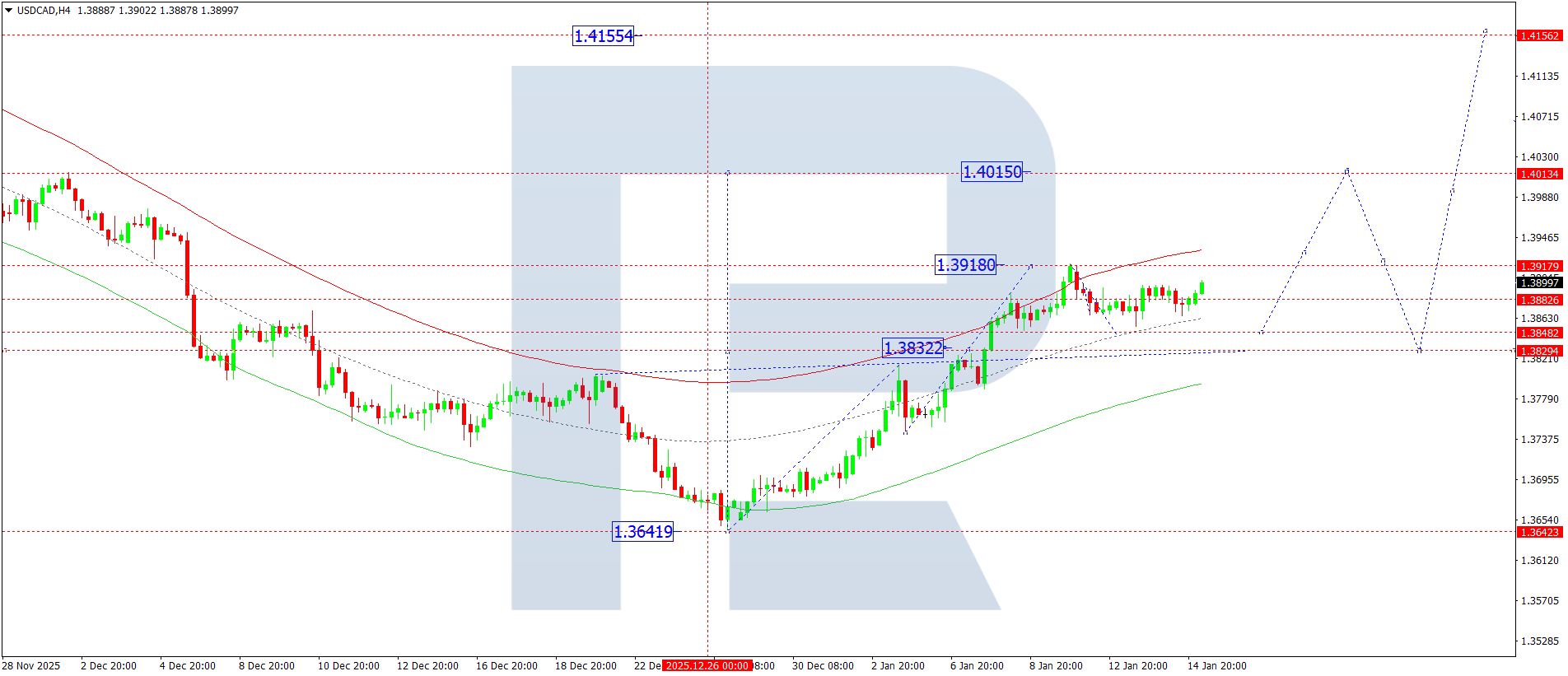 บนกราฟ H4 ของ USDCAD ตลาดกำลังก่อตัวช่วงการแกว่งตัวแบบสะสมกำลังบริเวณระดับ 1.3883 วันนี้ 15 มกราคม 2026 ช่วงดังกล่าวได้ขยายตัวลงไปยังระดับ 1.3855 และขึ้นไปยังระดับ 1.3890 หากระดับนี้ถูกทะลุขึ้น จะเปิดโอกาสให้เริ่มต้นคลื่นขาขึ้นรอบใหม่ไปยังระดับ 1.4010 ซึ่งเป็นเป้าหมายแรก