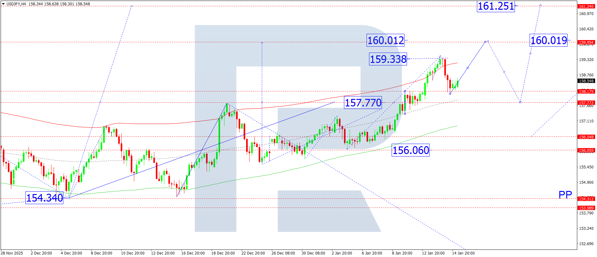 บนกราฟ H4 ของ USDJPY ตลาดได้ทะลุขึ้นเหนือระดับ 158.18 และเสร็จสิ้นคลื่นไปยังระดับ 159.40 วันนี้ 15 มกราคม 2026 คู่เงินได้ปรับฐานลงสู่ระดับ 158.09 (การทดสอบจากด้านบน) หลังจากนั้น อาจเกิดคลื่นขาขึ้น โดยมีเป้าหมายที่ระดับ 160.00