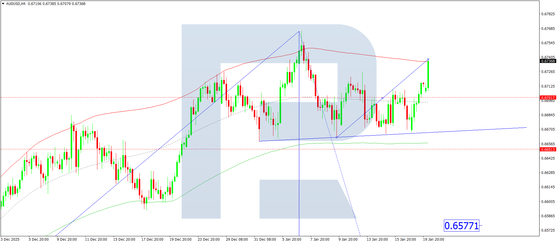 บนกราฟ H4 ของ AUDUSD ตลาดกำลังก่อตัวช่วงการแกว่งตัวแบบสะสมกำลังบริเวณระดับ 0.6700 วันนี้ 20 มกราคม 2026 ช่วงดังกล่าวได้ขยายตัวขึ้นไปยังระดับ 0.6737 หลังจากนั้น อาจเริ่มต้นคลื่นขาลงไปยังระดับ 0.6650 การหลุดต่ำกว่าระดับนี้จะเปิดทางไปสู่ระดับ 0.6595