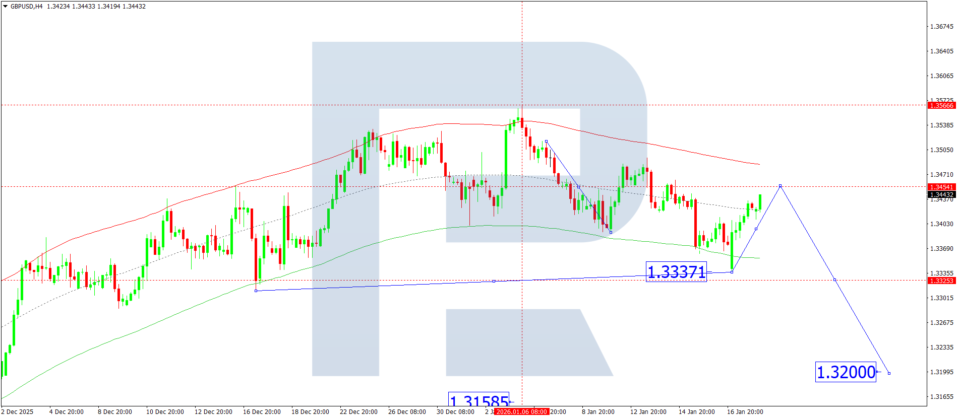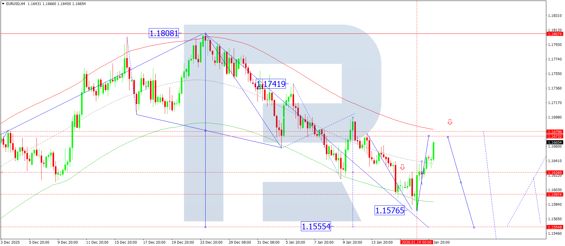 บนกราฟ H4 ของ EURUSD ตลาดกำลังก่อตัวคลื่นขาขึ้นไปยังระดับ 1.1675 วันนี้ 20 มกราคม 2026 ราคาอาจไปถึงระดับเป้าหมายนี้ ต่อไป อาจเกิดคลื่นขาลงไปยังระดับ 1.1620 ซึ่งอาจขยายตัวต่อไปยังระดับ 1.1555 เป็นเป้าหมายแรก