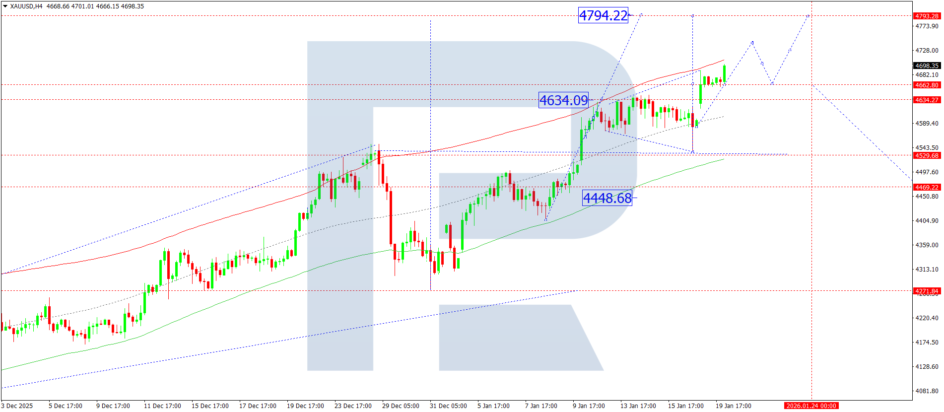 บนกราฟ H4 ของ XAUUSD ตลาดได้ทะลุขึ้นเหนือระดับ 4,686 และยังคงพัฒนาคลื่นขาขึ้นไปยังระดับ 4,790 วันนี้ 20 มกราคม 2026 คาดว่าราคาจะไปถึงระดับเป้าหมายนี้ ต่อไป ยังมีความเป็นไปได้ของการปรับฐานลงสู่ระดับ 4,686 หลังจากนั้น คาดว่าจะเกิดการปรับตัวขึ้นต่อไปยังระดับ 4,855