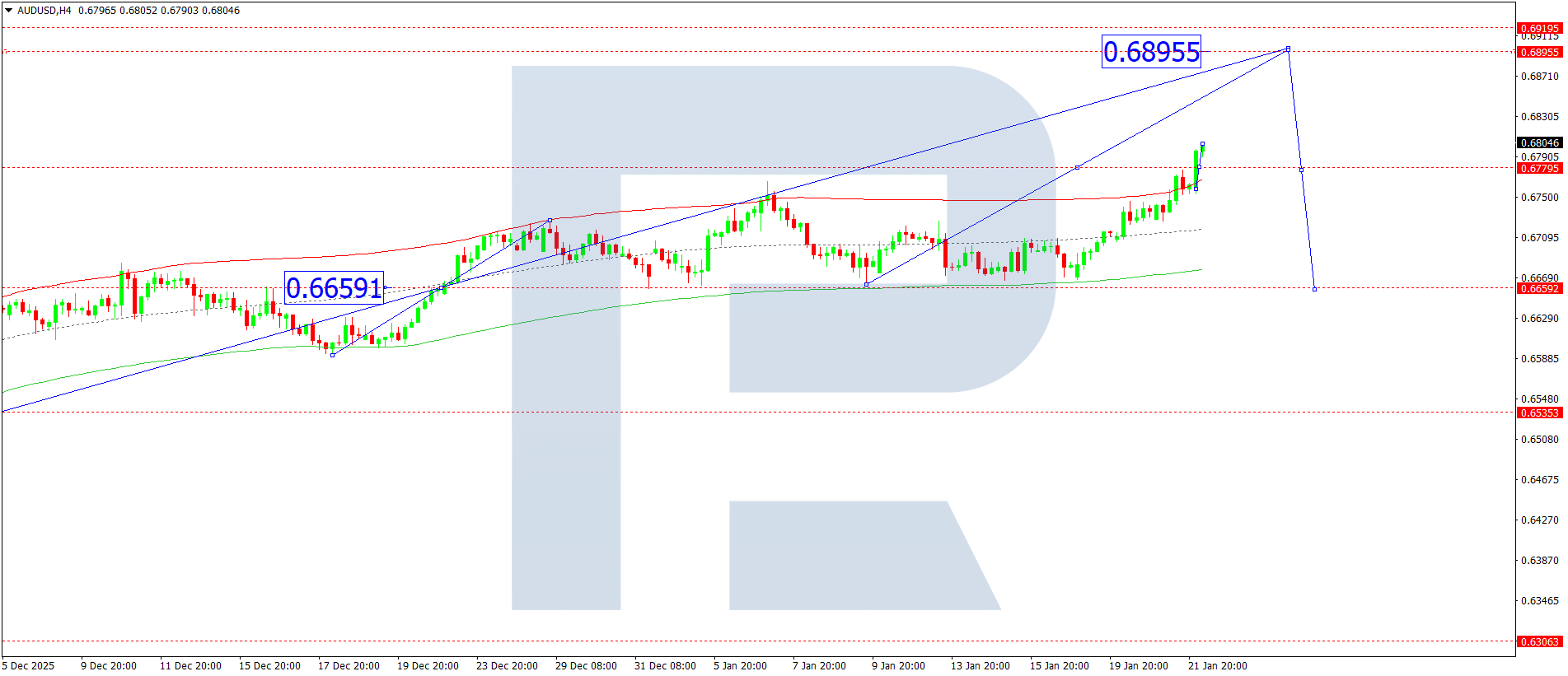 บนกราฟ H4 ของ AUDUSD ตลาดกำลังก่อตัวช่วงการแกว่งตัวแบบสะสมกำลังบริเวณระดับ 0.6777 วันนี้ 22 มกราคม 2026 ช่วงดังกล่าวได้ขยายตัวขึ้นไปยังระดับ 0.6800 หลังจากนั้น อาจเริ่มต้นคลื่นขาลงไปยังระดับ 0.6777 และอาจตามด้วยการปรับตัวขึ้นไปยังระดับ 0.6890