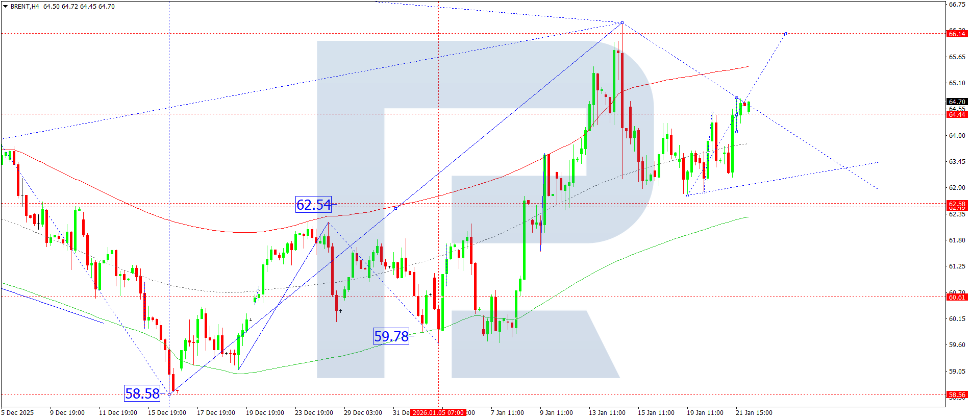 บนกราฟ H4 ของ Brent ตลาดกำลังก่อตัวช่วงการแกว่งตัวแบบสะสมกำลังบริเวณระดับ 64.44 วันนี้ 22 มกราคม 2026 ไม่สามารถตัดความเป็นไปได้ของคลื่นปรับฐานลงสู่ระดับ 64.00 ออกไปได้ ต่อไป อาจเริ่มต้นคลื่นขาขึ้น โดยมีเป้าหมายที่ระดับ 66.75