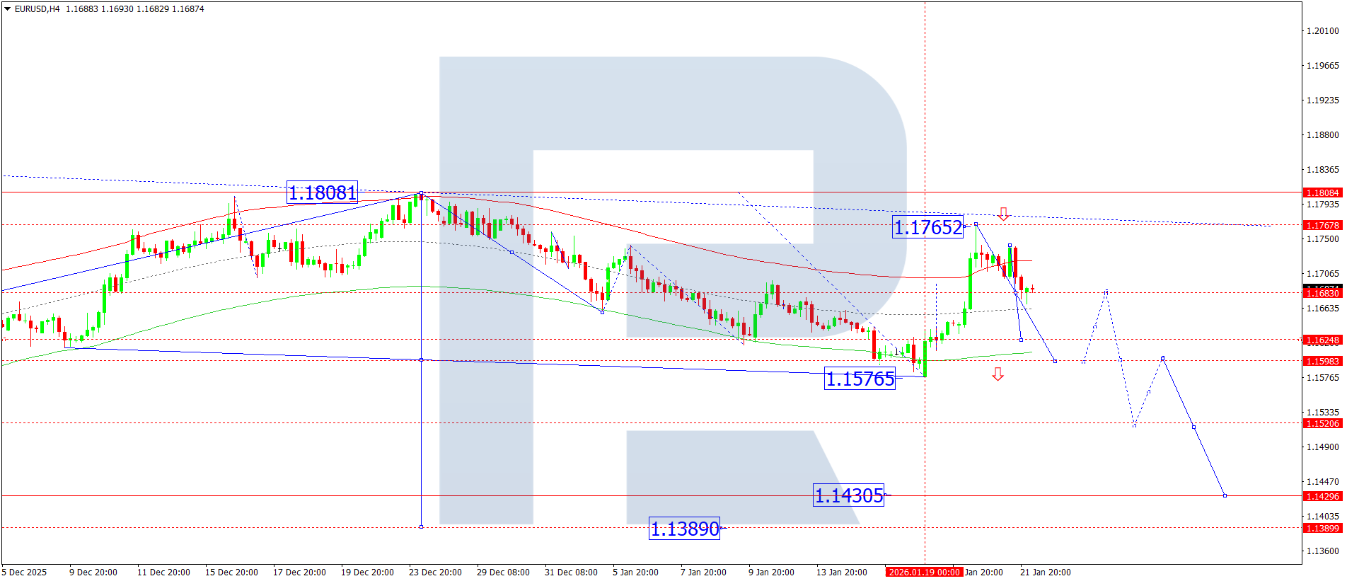 บนกราฟ H4 ของ EURUSD ตลาดกำลังก่อตัวช่วงการแกว่งตัวแบบสะสมกำลังบริเวณระดับ 1.1683 วันนี้ 22 มกราคม 2026 มีความเป็นไปได้ที่จะเกิดการทะลุลงจากช่วงดังกล่าว โดยมีเป้าหมายที่ระดับ 1.1628 หากราคาทะลุลงต่ำกว่าระดับนี้ จะเปิดโอกาสให้ปรับตัวลงต่อไปยังระดับ 1.1590