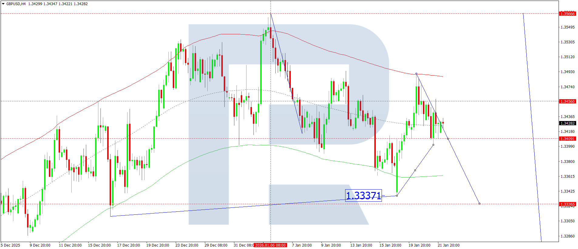 บนกราฟ H4 ของ GBPUSD ตลาดกำลังก่อตัวช่วงการแกว่งตัวแบบสะสมกำลังบริเวณระดับ 1.3434 วันนี้ 22 มกราคม 2026 คาดว่าจะเกิดคลื่นขาลงไปยังระดับ 1.3326 การทะลุลงต่ำกว่าระดับนี้จะเปิดทางไปสู่การเคลื่อนไหวของคลื่นไปยังระดับ 1.3260