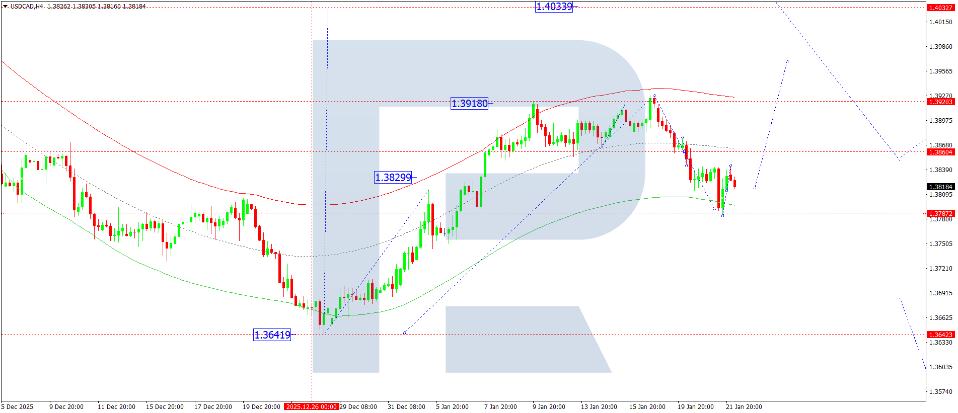 บนกราฟ H4 ของ USDCAD ตลาดได้เสร็จสิ้นคลื่นขาลงไปยังระดับ 1.3785 วันนี้ 22 มกราคม 2026 คาดว่าจะเริ่มต้นคลื่นขาขึ้นรอบใหม่ โดยมีเป้าหมายที่ระดับ 1.3860 และอาจขยายตัวต่อไปยังระดับ 1.4010 ซึ่งเป็นเป้าหมายแรก