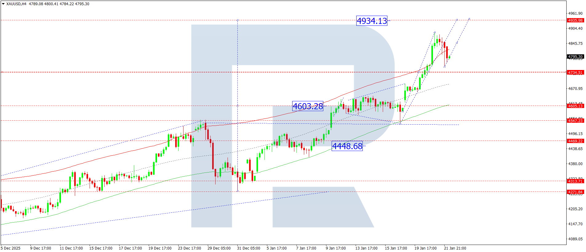 บนกราฟ H4 ของ XAUUSD ตลาดกำลังเสร็จสิ้นการปรับฐานลงสู่ระดับ 4,755 และยังคงพัฒนาคลื่นขาขึ้นไปยังระดับ 4,933 วันนี้ 22 มกราคม 2026 คาดว่าราคาจะไปถึงระดับเป้าหมายนี้ ต่อไป ยังมีความเป็นไปได้ของการปรับฐานลงสู่ระดับ 4,735 จากนั้นตามด้วยการปรับตัวขึ้นไปยังระดับ 5,030