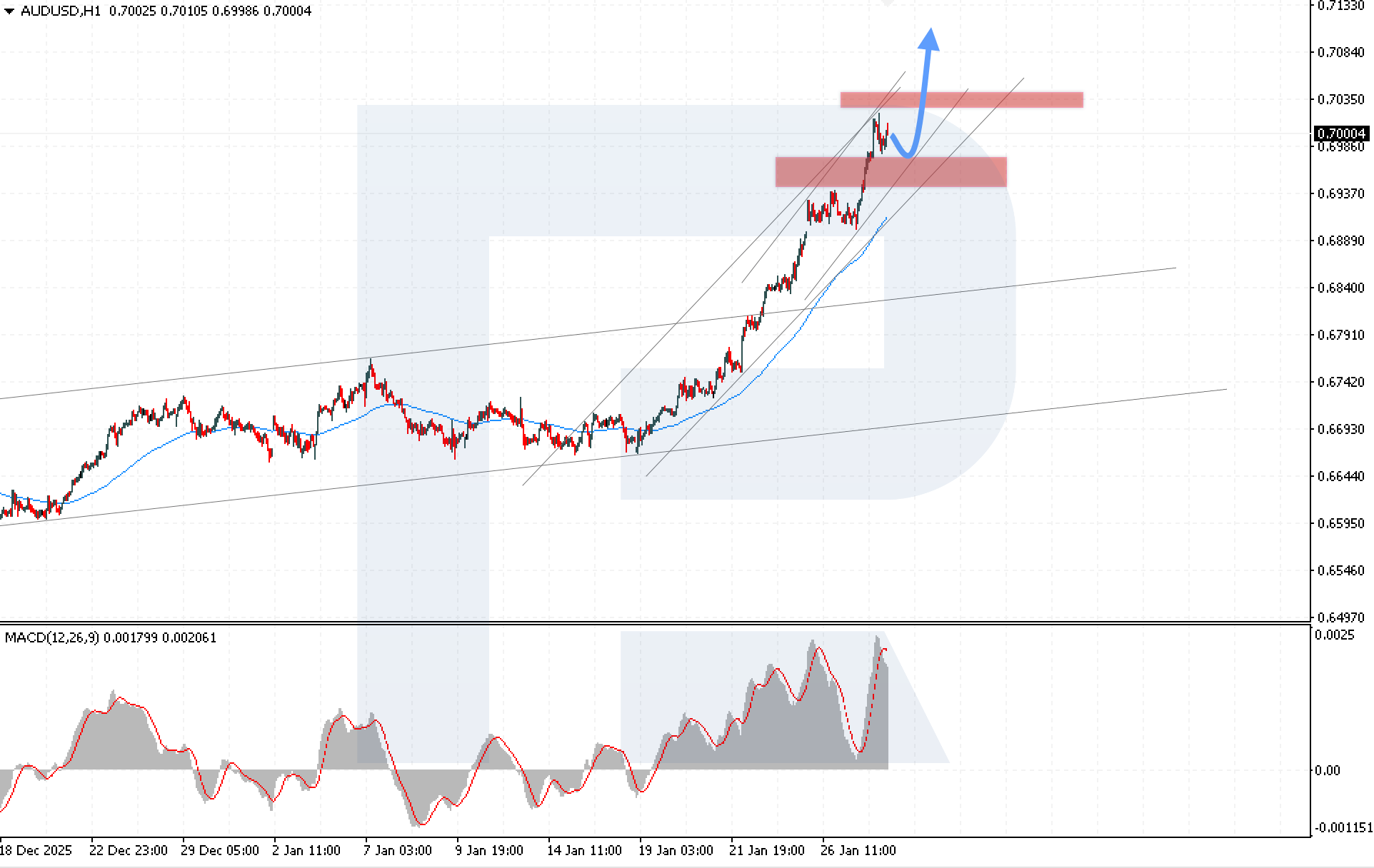 บนกราฟ H1 ของคู่สกุลเงิน AUDUSD ตลาดกำลังปรับตัวขึ้นหลังจากดีดตัวจากแนวรับในระยะสั้นที่ระดับ 0.6975 แนวต้านที่ใกล้ที่สุดของ AUDUSD อยู่ที่ระดับ 0.7035 วันนี้ 28 มกราคม 2026 คาดว่าการปรับฐานจะดำเนินต่อไปยังบริเวณ 0.6980 หลังจากการปรับฐานและการสะสมตัวเสร็จสิ้น คาดว่าคู่เงินจะกลับมามีแรงส่งขาขึ้น โดยมีเป้าหมายที่ระดับ 0.7145