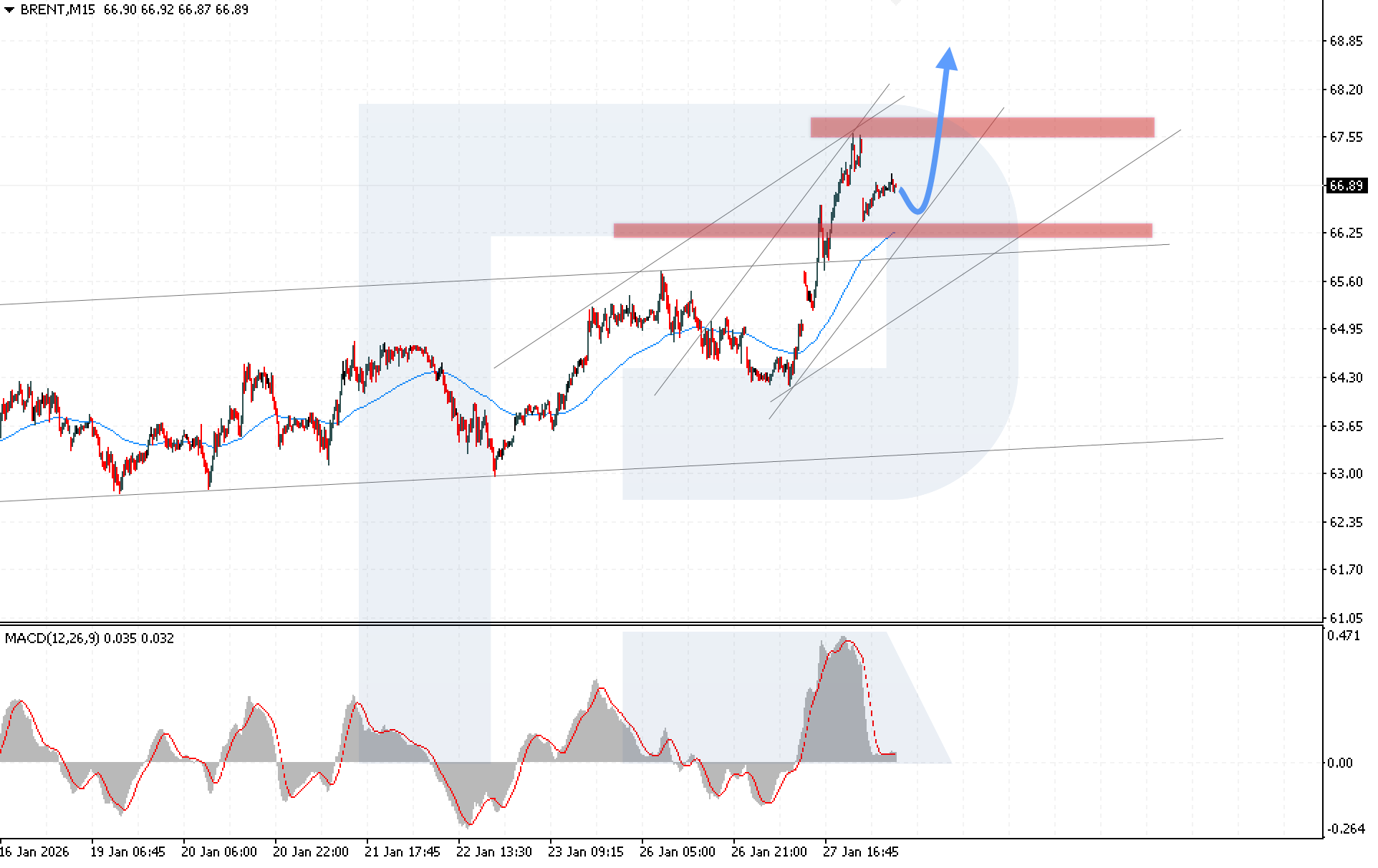 บนกราฟ M15 ของน้ำมันดิบ Brent ตลาดกำลังปรับตัวขึ้นหลังจากทะลุขอบบนของกรอบแนวโน้มขาขึ้น แนวรับที่ใกล้ที่สุดของ Brent อยู่ที่ระดับ 66.25 วันนี้ 28 มกราคม 2026 มีความเป็นไปได้ของการปรับฐานไปยังขอบล่างของกรอบแนวโน้มที่ระดับ 66.35 หลังจากการปรับฐานเสร็จสิ้น คาดว่าจะเกิดการกลับมาของแรงส่งขาขึ้น โดยมีเป้าหมายที่ระดับ 68.85