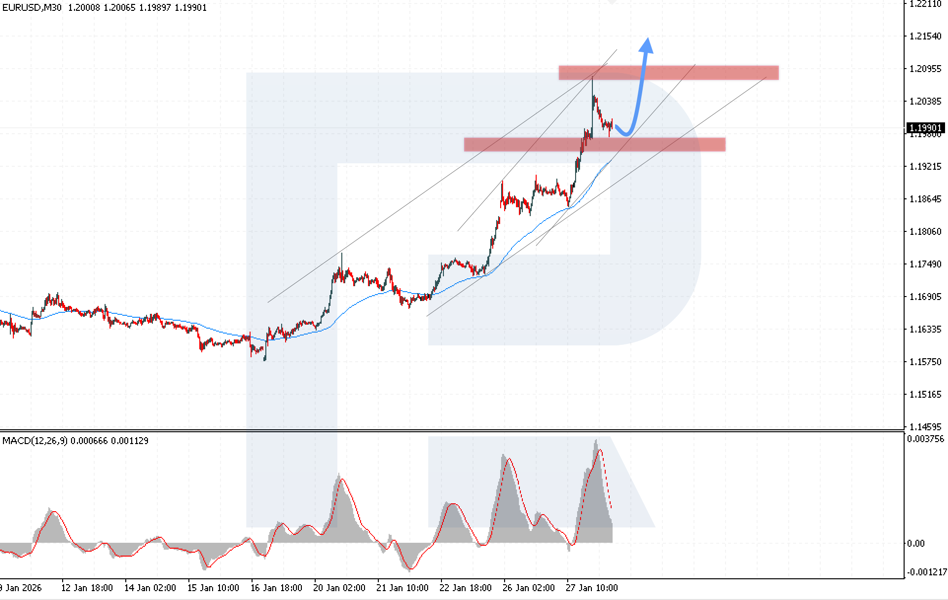 ภาพทางเทคนิคสนับสนุนสถานการณ์นี้ โดยราคายังคงเคลื่อนไหวอยู่ภายในกรอบแนวโน้มขาขึ้น ฝั่งผู้ซื้อยังคงพยุงราคาไว้เหนือเส้น EMA-85 และการวิเคราะห์อินดิเคเตอร์ MACD แสดงให้เห็นว่าฮิสโตแกรมกำลังลดลง ซึ่งยืนยันถึงช่วงการสะสมตัว เงื่อนไขสำคัญสำหรับสถานการณ์ขาขึ้นของ EURUSD คือการที่ราคาสามารถยืนเหนือระดับ 1.2035 ได้อย่างมั่นคง