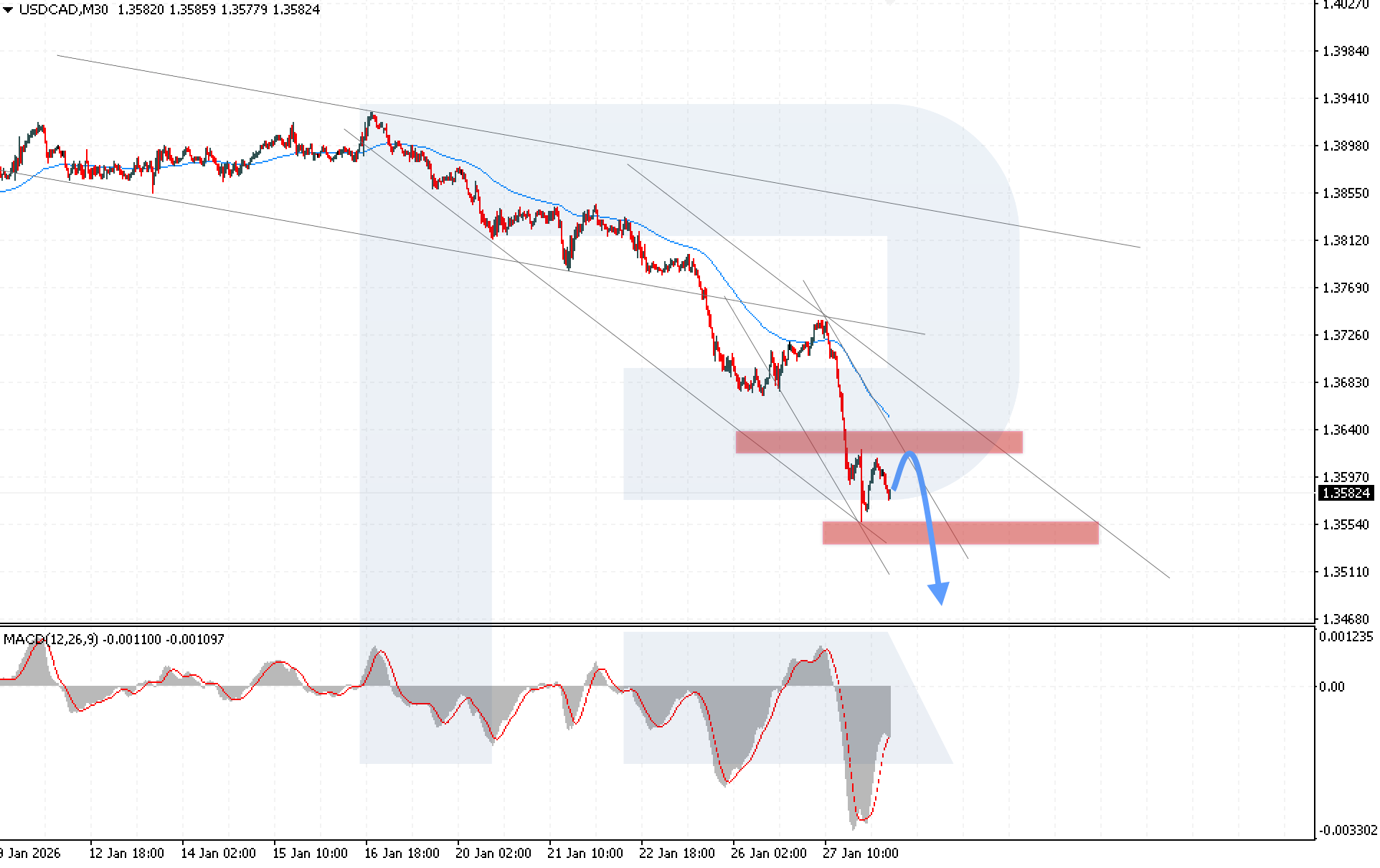 บนกราฟ M30 ของคู่สกุลเงิน USDCAD ตลาดกำลังปรับตัวลงอย่างแข็งแกร่งหลังจากดีดตัวจากแนวต้านในระยะสั้นที่ระดับ 1.3635 แนวรับที่ใกล้ที่สุดของ USDCAD อยู่ที่ระดับ 1.3550 วันนี้ 28 มกราคม 2026 มีแนวโน้มที่จะเกิดการฟื้นตัวเชิงแก้ไขไปยังบริเวณ 1.3630 หลังจากการฟื้นตัวเสร็จสิ้น คาดว่าแรงส่งขาลงจะกลับมาอีกครั้ง โดยมีเป้าหมายที่ระดับ 1.3425