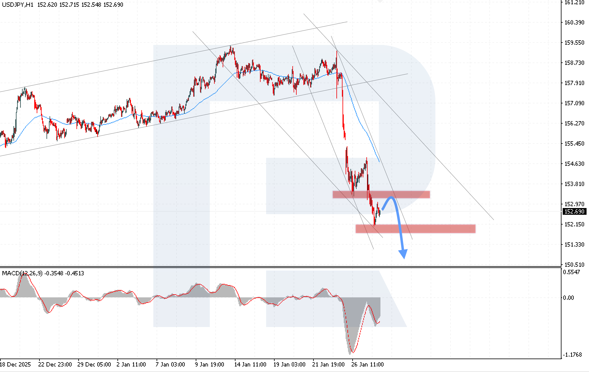 บนกราฟ H1 ของคู่สกุลเงิน USDJPY ตลาดกำลังพยายามฟื้นตัวหลังจากแรงกดดันขาลงอย่างรุนแรง แนวต้านที่ใกล้ที่สุดของ USDJPY อยู่ที่ระดับ 153.55 วันนี้ 28 มกราคม 2026 มีแนวโน้มที่จะเกิดการฟื้นตัวเชิงแก้ไขในระดับปานกลางไปยังบริเวณดังกล่าว หลังจากการฟื้นตัวเสร็จสิ้น คาดว่าการปรับตัวลงจะกลับมาอีกครั้ง โดยมีเป้าหมายที่ระดับ 150.65