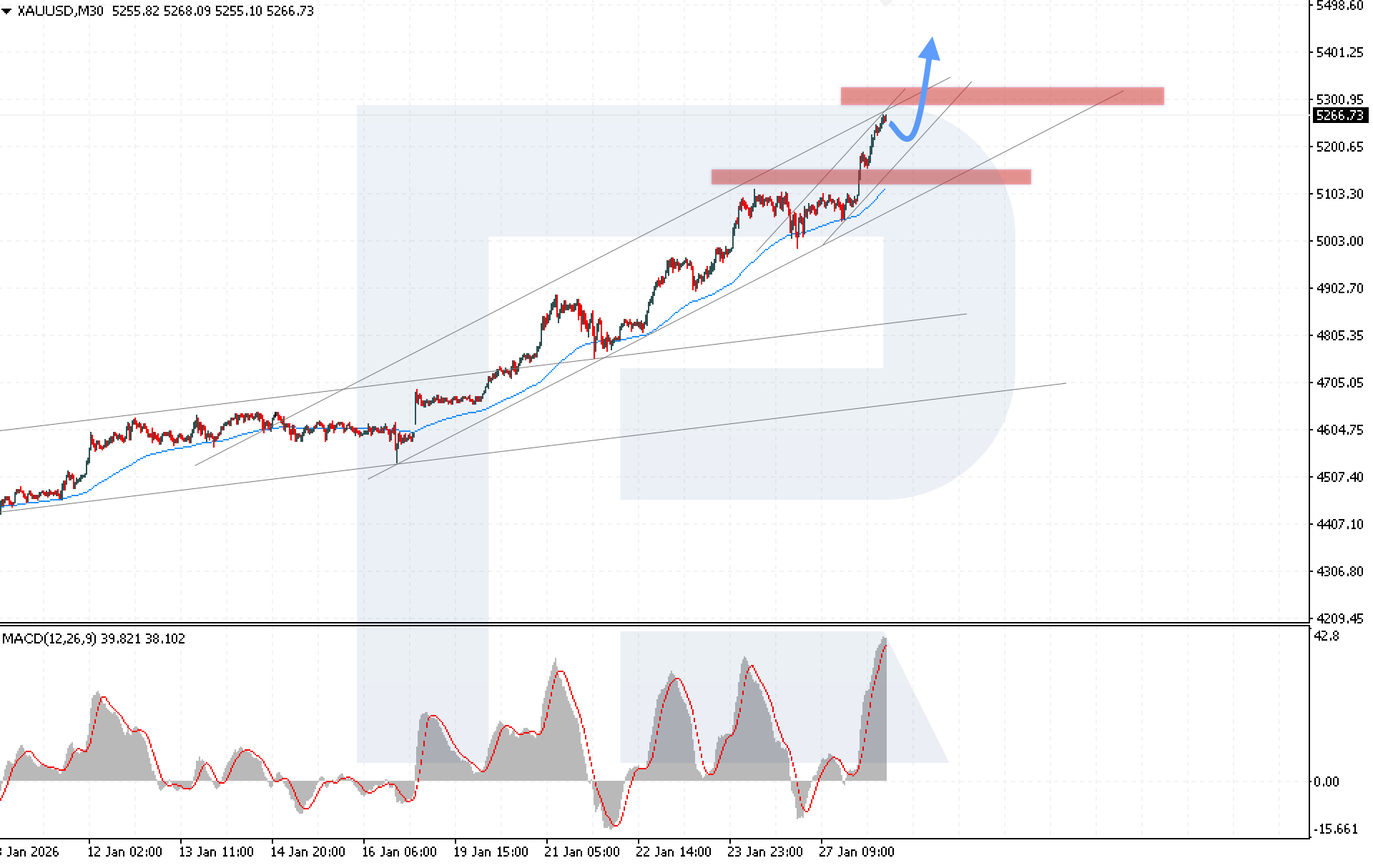 ภาพทางเทคนิคสนับสนุนสถานการณ์นี้ โดยราคายังคงเคลื่อนไหวอยู่ภายในกรอบแนวโน้มขาขึ้น และการวิเคราะห์อินดิเคเตอร์ MACD แสดงให้เห็นถึงการเติบโตอย่างแข็งแกร่งของฮิสโตแกรม ซึ่งบ่งชี้ถึงการพัฒนาอย่างต่อเนื่องของแรงส่งขาขึ้น เงื่อนไขสำคัญสำหรับสถานการณ์ขาขึ้นของ XAUUSD คือการที่ราคาสามารถยืนเหนือระดับ 5,305 ได้อย่างมั่นคง