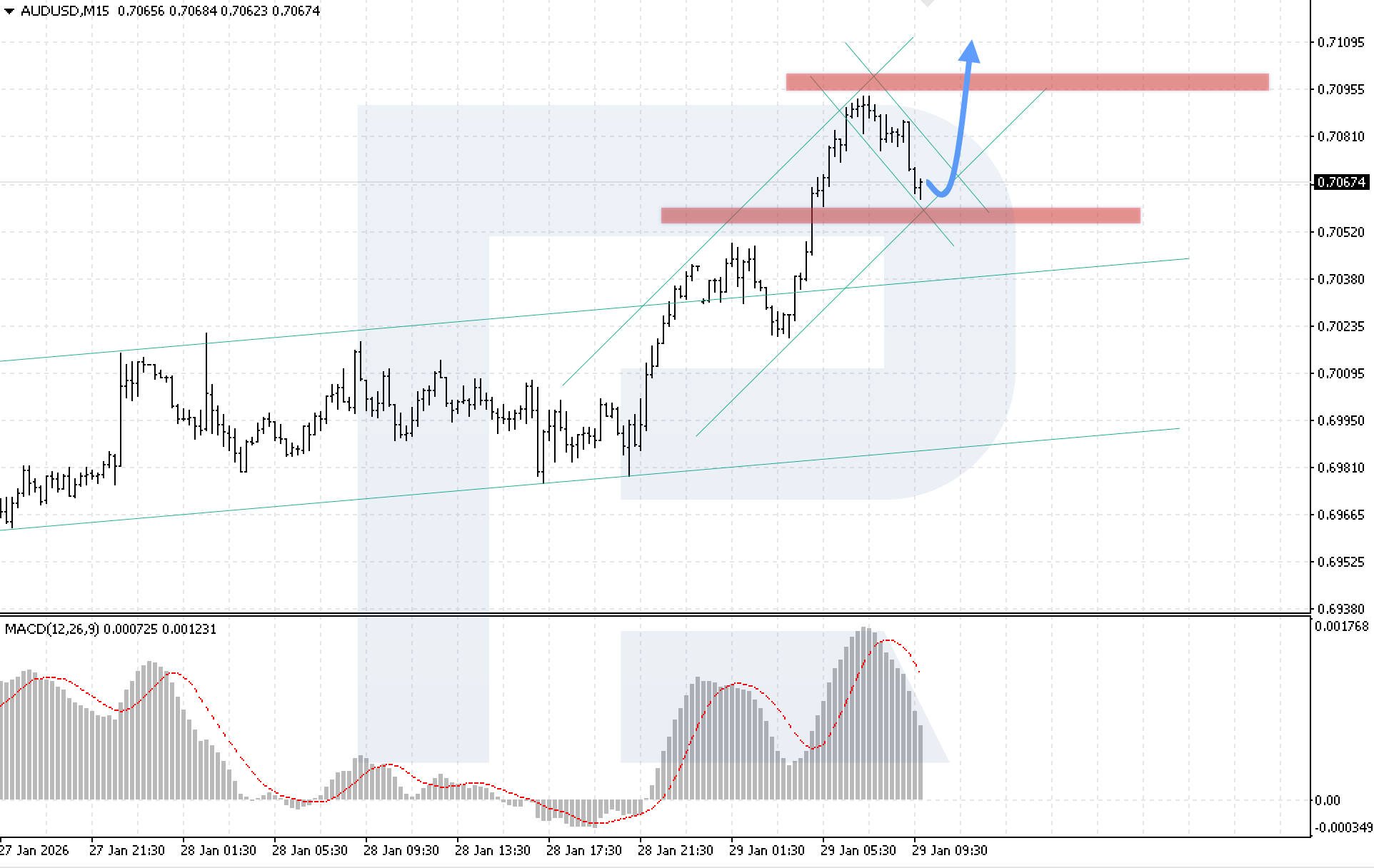 บนกราฟ M15 ของคู่สกุลเงิน AUDUSD ตลาดกำลังเคลื่อนไหวอยู่ในช่วงการปรับฐาน โดยเข้าใกล้ขอบล่างของช่องขาขึ้น แนวต้านใกล้ที่สุดของ AUDUSD อยู่ที่ระดับ 0.7095 วันนี้ 29 มกราคม 2026 การเคลื่อนไหวเชิงปรับฐานอาจดำเนินต่อไปยังระดับ 0.7055 หลังจากการปรับตัวลงเสร็จสิ้น คาดว่าโมเมนตัมขาขึ้นจะกลับมาอีกครั้ง โดยมีเป้าหมายที่ระดับ 0.7110